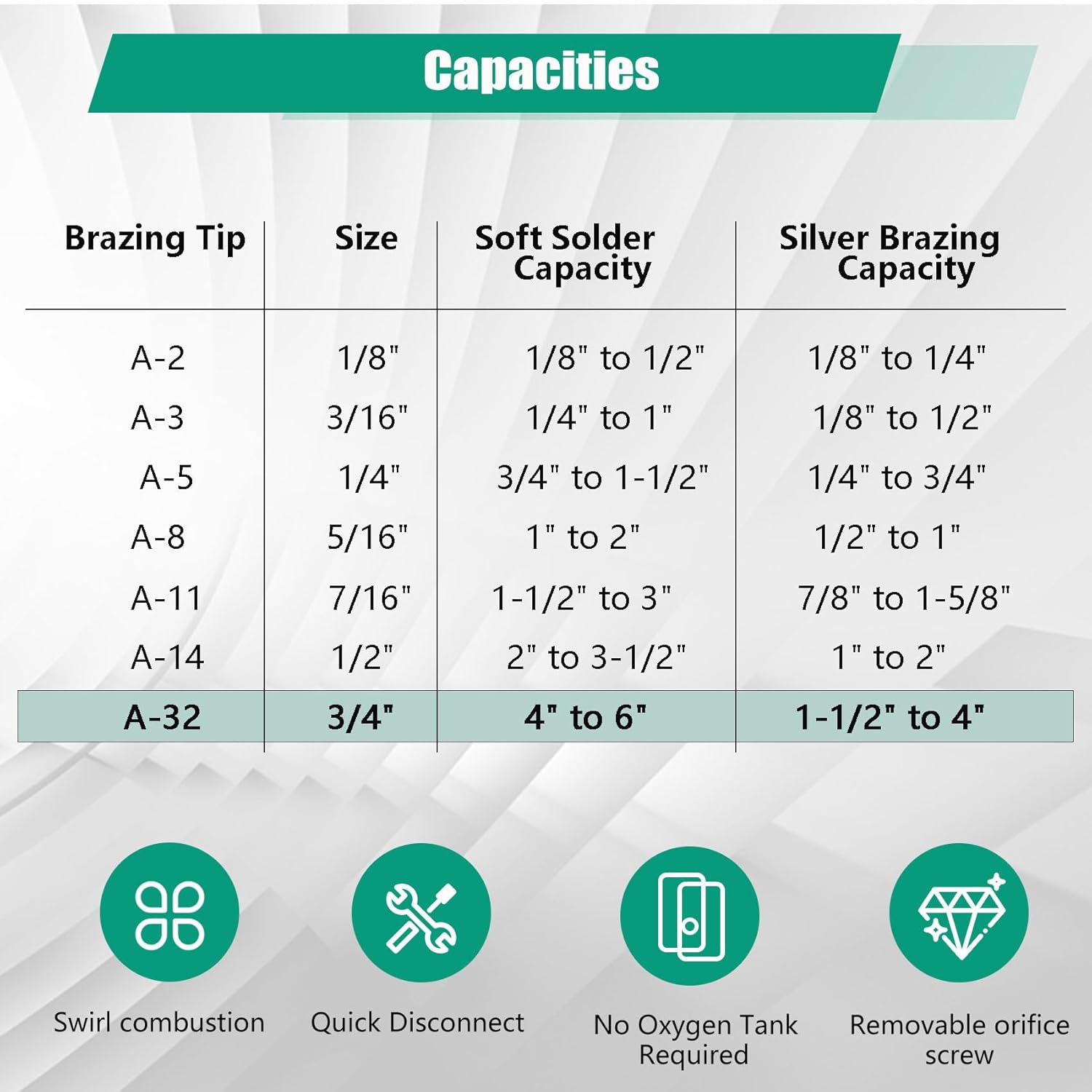0386-0106 A-32 3/4" Air Acetylene Torch Tip for Turbo Torch G-4 or PLF-A5 Handles, Soft Solder 4 to 6", Silver Braze 1-1/2 to 4", Manual Lighting, Quick Connect, Removable Orifice Screw