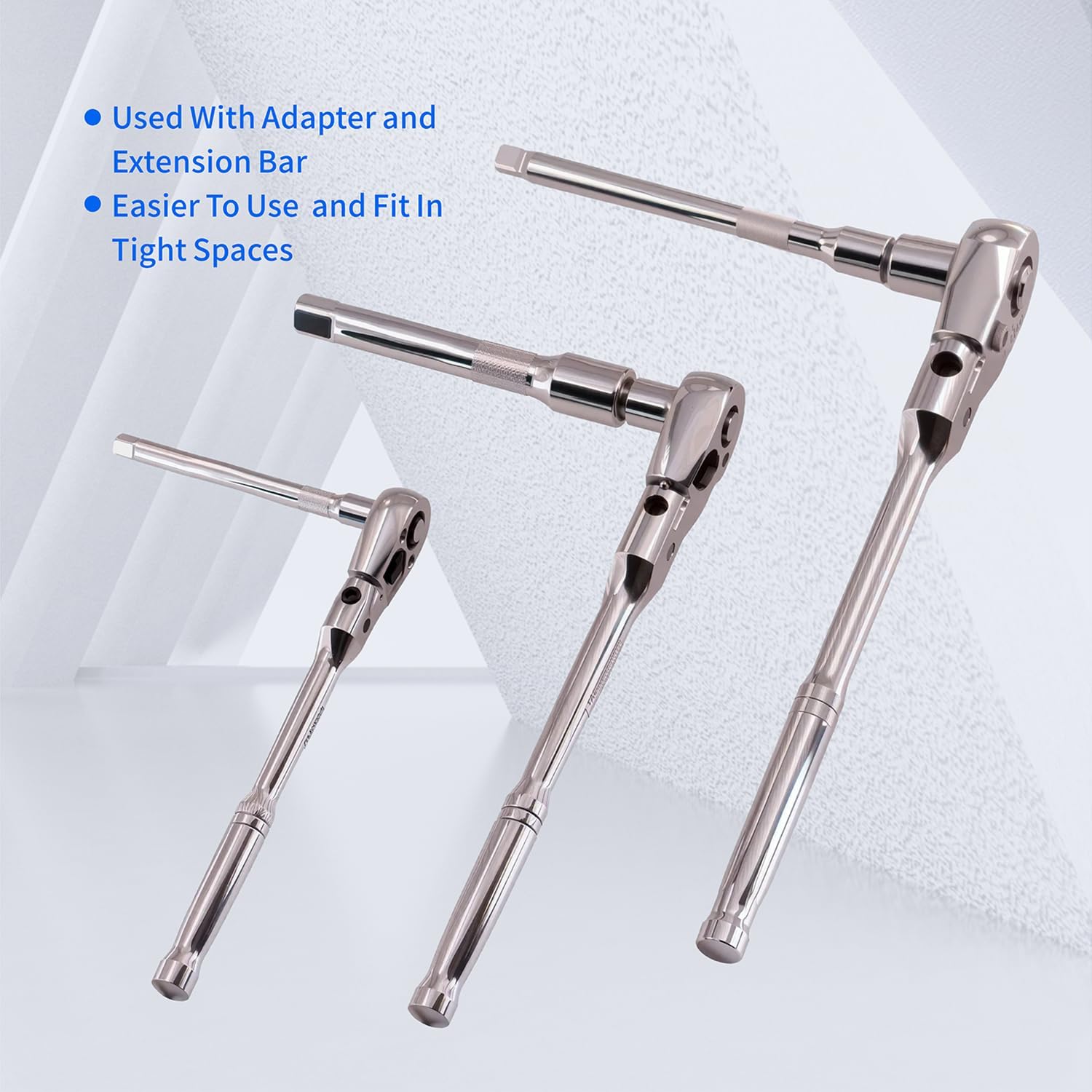 10 Piece Flex Head Ratchet Set, 1/4", 3/8" and 1/2" Drive Swivel Head Ratchet Wrench with Extension Bar and 4pc Adapter, 72-Tooth Flexible Wrench Handle with Quick-Release Reversible Design