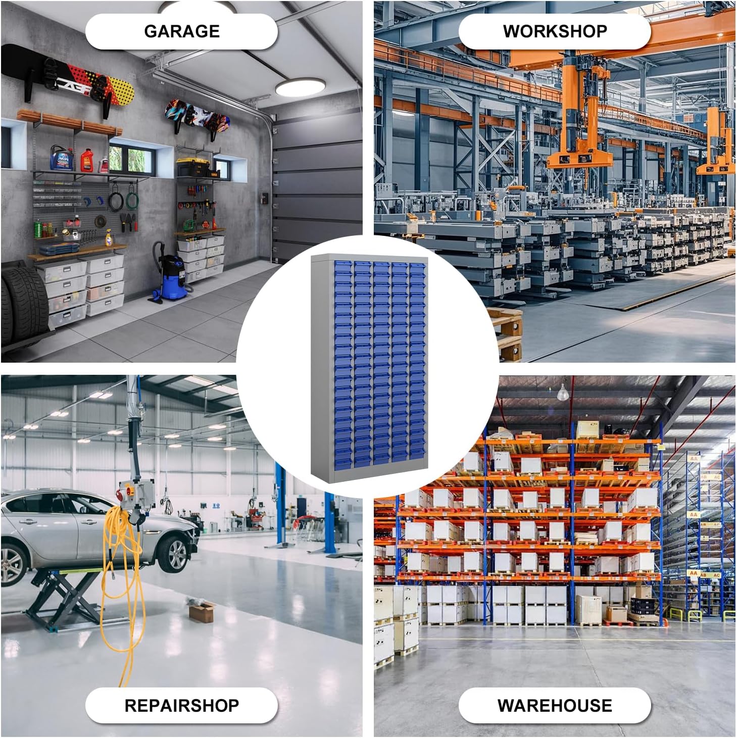 ENVIRONMENTALLY FRIENDLY AND DURABLE: The parts cabinet is made of all-steel with a phosphorus-free electrostatic powder coated surface, which is safe and environmentally friendly. The small drawer is made of thickened ABS material, strong bearing capacity, durable, oily materials can also be stored.