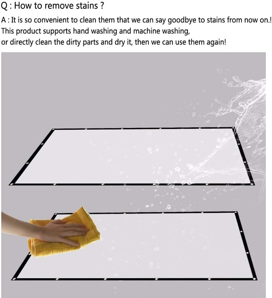 Features Wrap fabric viewing surface diffuses projected light uniformly16:9 screen format and diagonal 100" . Wrap fabric With 1.1 Gain . Easy installation and disassembly make it more comfortable . Can be applied to home theater movies, classroom training, conference room presentation, public display, etc. Can be spot cleaned (do NOT use abrasives). Specification Diagonal Measurement: 100 inch. 16:9 Thicken Foldable 100 inch Projector Screen Matt White Front Rear HD 3D Screen for Projection Screen Home Theater. Simple Wrap Fabric 100 inch Roll Up Projection Screen 100 inch 16:9 Portable Projector Screen for Business Meeting. This Durable wrap fabric surface is the premier choice when ambient light is controllable. It diffuses projected light uniformly, and you will find a perfect visual enjoyment with optimal image and color reproduction. With Adhesive velcros, this projector screen become more comfortable by its easy installation and disassembly. This projector screen is an ideal choice for home theater movies, classroom training, conference room presentations, public display, etc. May have slight blemishes or stubborn folds but should generally be OK for projection. Specifications Size: 221cm x 124cm; 100 inch; Ratio: 16:9 Material: wrap fabric. Package included: 1* Foldable Projector Screen Cloth. Note:Light shooting and different displays may cause the color of the item in the picture a little different from the real thing. The measurement allowed error is +/- 1-3 cm.