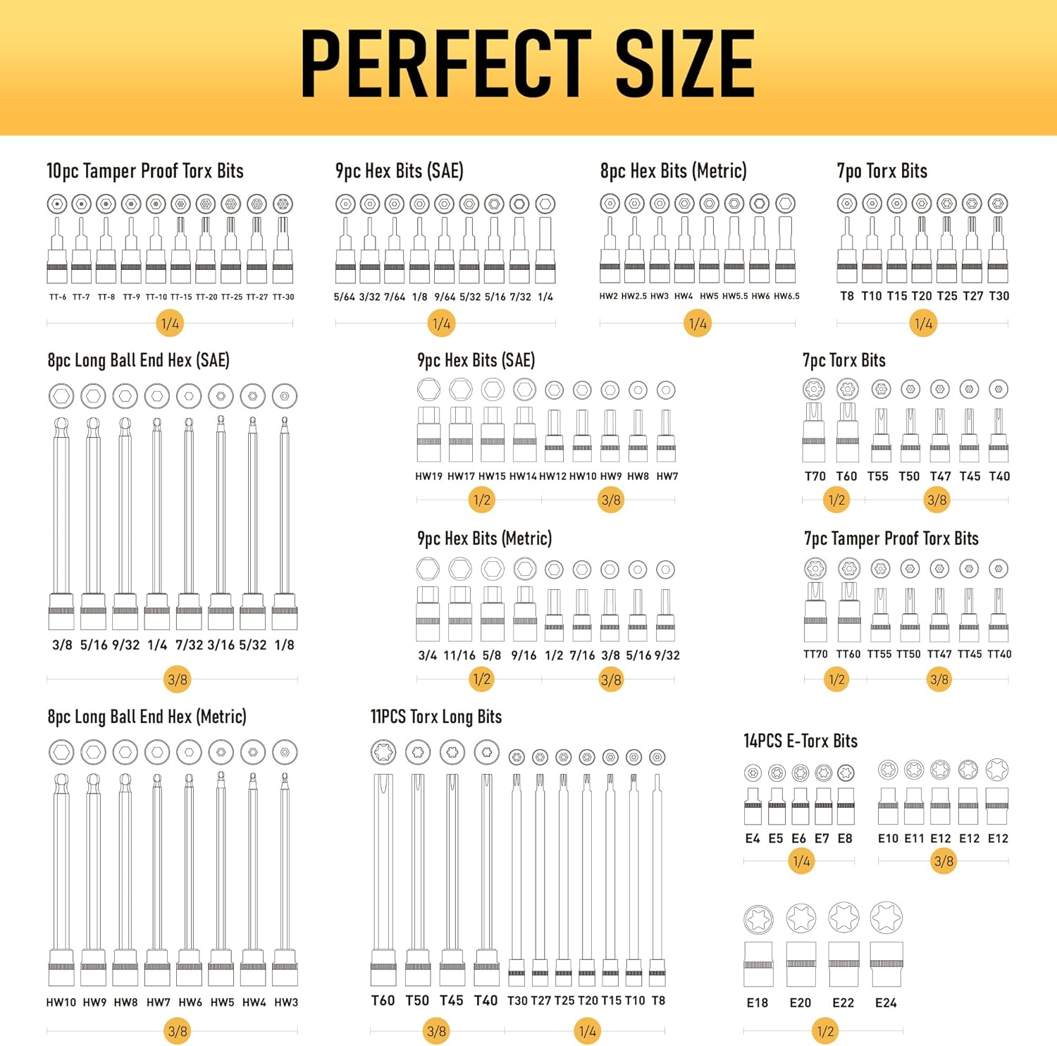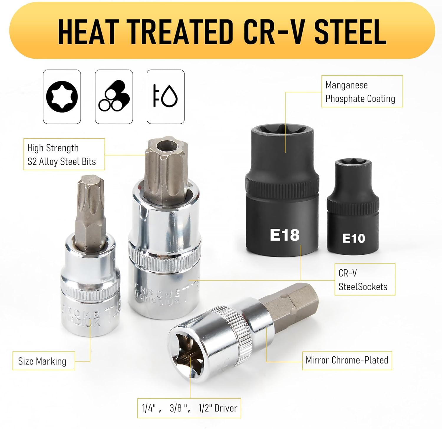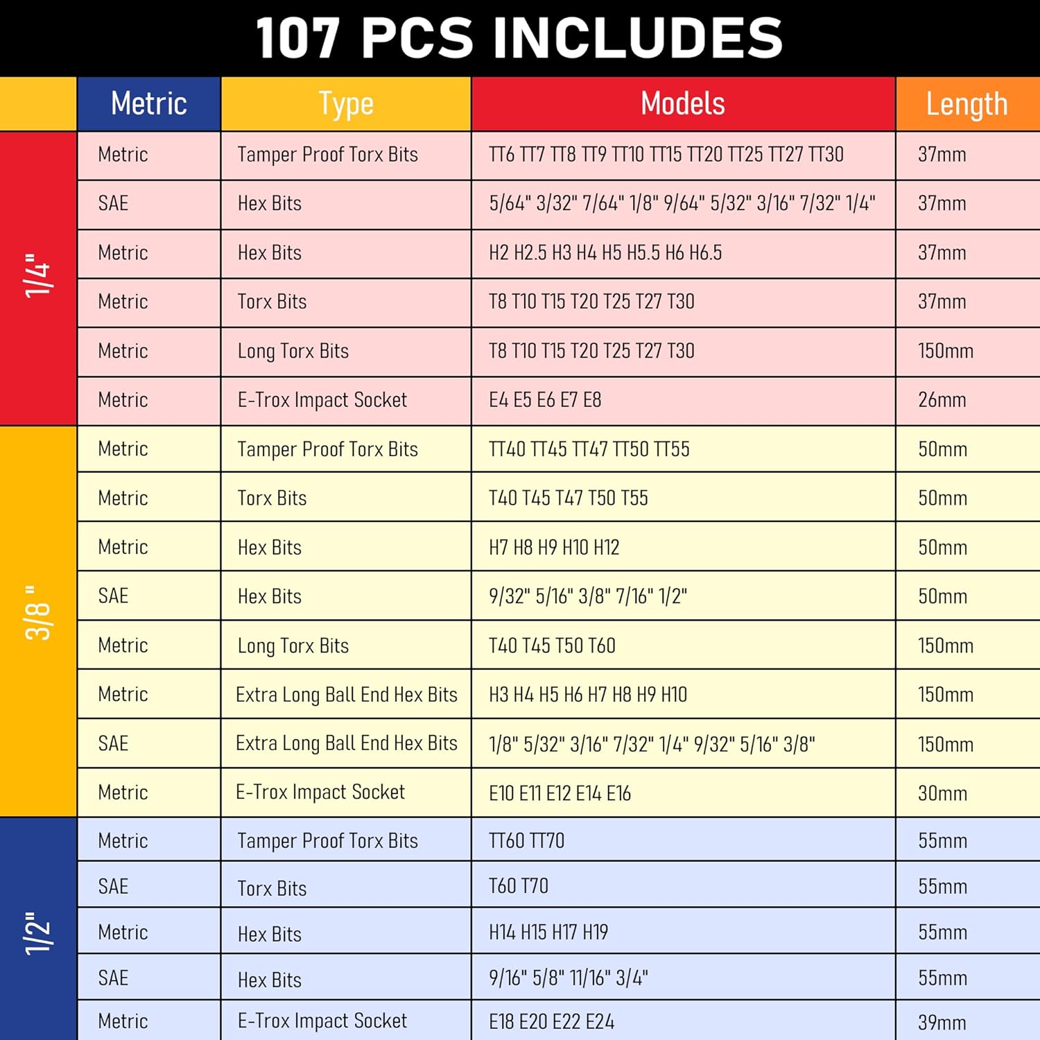 107-Piece Master Torx & Allen Bit Socket Set, 1/4", 3/8", 1/2" Drive, Long Torx & Ball End Hex Bits, Tamper-Resistant Star, E-Star Sockets, SAE & Metric, S2 Steel Storage Case