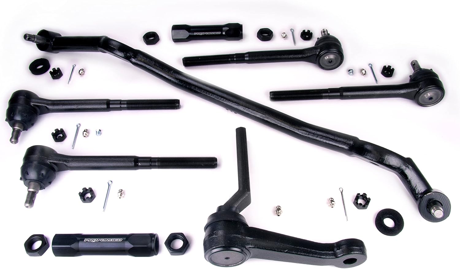 Save time and money by purchasing all of the necessary components in one complete kit. Trick, billet aluminum adjusting sleeves save weight while eliminating steering slop and making adjustments a breeze. Proforged steering parts feature forged steel housings and ball studs for ultimate strength and durability. They're precision CNC machined for excellent fit and finished and then sealed with durable rubber boots to keep grease in and dirt out.