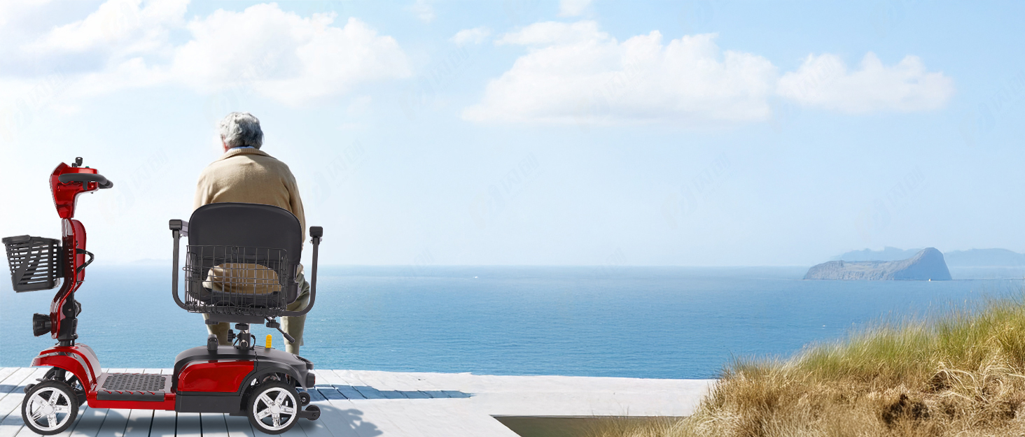The Eldryvon folding mobility scooter can be disassembled into four parts: the foldable tiller, removable seat, and detachable front and rear baskets.