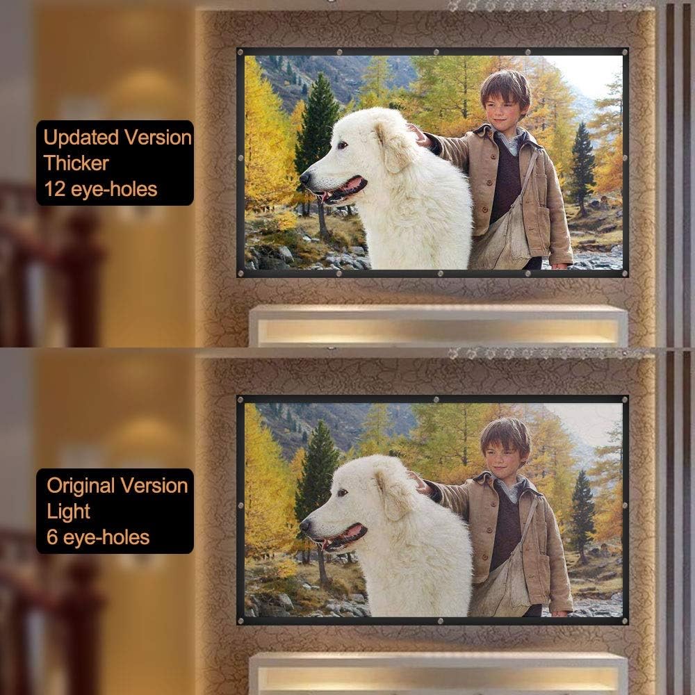 Bullet Points: Creaseless: Be made of flexible polyester material, this projector screen is more smooth and creaseless, bring you an excellent viewing image. Portable:Lightweight, Foldable and Portable, ideal for indoor and outdoor activities. Easy-Install:12 eyeholes on the screen, 12 pieces peel-and-stick hooks, easy to install. Comfortable:100 inches 16:9 projector screen, provide you 85.5” x 47.5” viewing area. Specifications 1. Screen Size 88.5 inch x 50 inch (224.5cm x 127cm). Please take in account, because it is flexible material, projection material sizes may vary by +/- 0.5” in length/width; 2. View size: 85.5 inch x 47.5inch (218cm x 121cm); 3. 100 inch; 4. Ratio: 16:9; 5. Material: Polyester. 6. 12 eyeholes on the screen, with 12 pieces peel-and-stick hooks, to make it easy to set up. Noted: Because it's designed for front & Rear projection. so its thickness is requested to make not so thick as front projection. Package included: 1* Foldable Projector Screen Cloth. Note:Light shooting and different displays may cause the color of the item in the picture a little different from the real thing. The measurement allowed error is +/- 1-3 cm.
