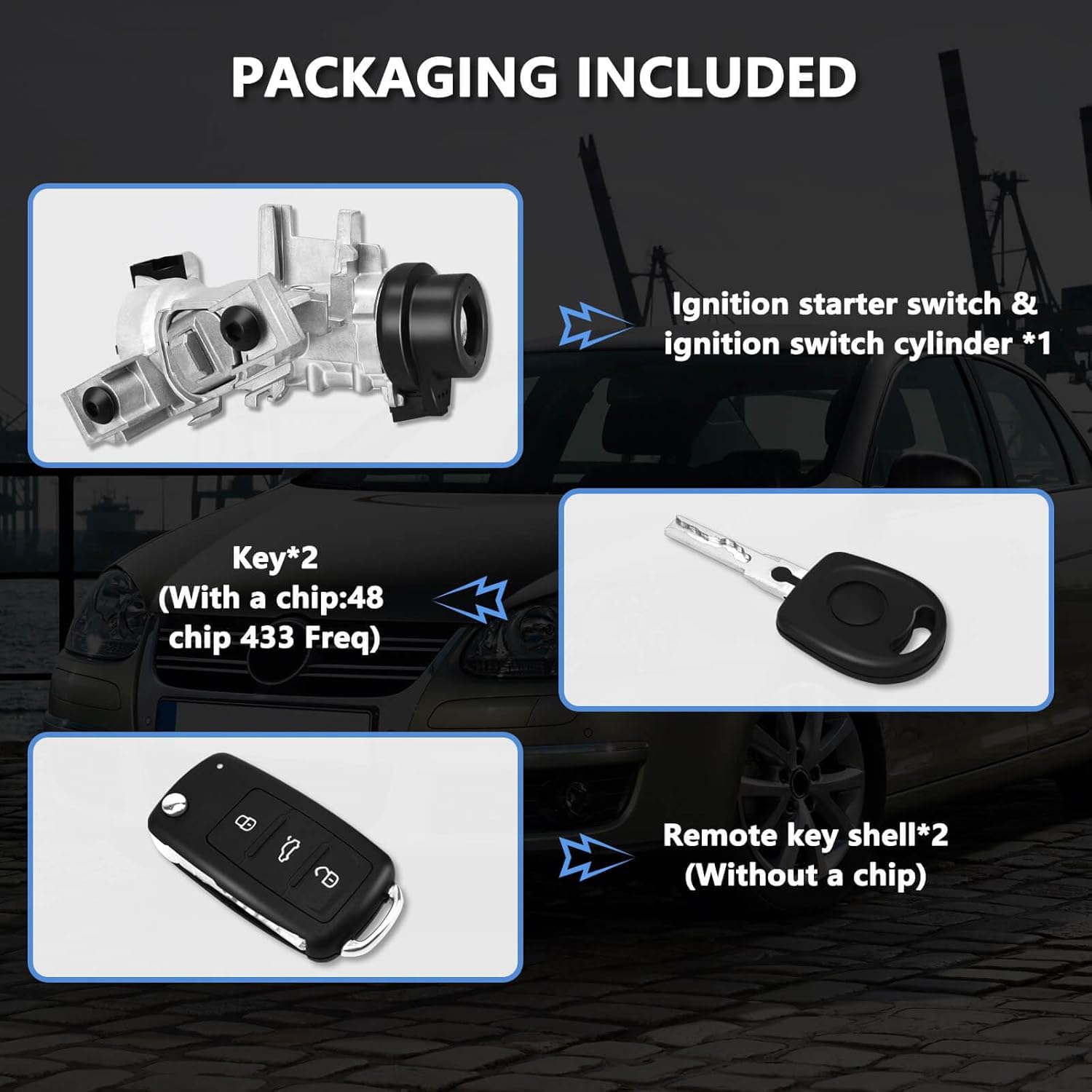 【Tips】①Using yourelf former chip→Remove your former chip to the our key shells (Needn't program) ② Using our blank chip(unprogrammed)→Need to contact local VW 4S stores or locksmith to decode and program (Needs extra fees) 【Compatible With】The ignition switch lock cylinder with key is compatible with 2006 2007 2008 2009 2010 2011 2012 2013 2014 2015 2016 2017 2018 Jetta, 2004 2005 2006 2007 2010 2011 Golf, 2007 2008 2009 2010 2011 EOS, 2006 2007 2008 2009 Rabbit, 2008 2009 2010 2011 Tiguan, 2012 2013 2014 2015 2016 2017 2018 2019 Passat 【Packaging Included】1x ignition starter switch & ignition switch cylinder; 2 x key (With a chip:48 chip 433 Freq); 2 x remote key shell(Without a chip)