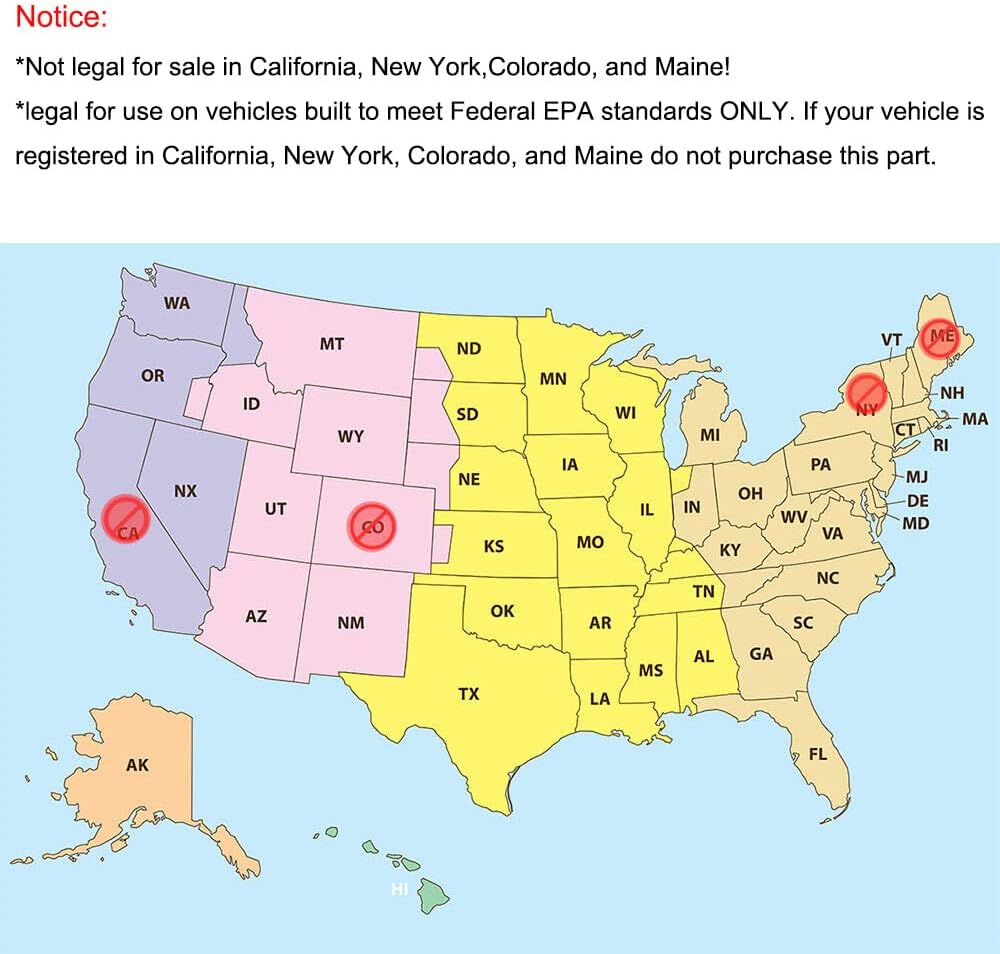 If your vehicle is registered in California, New York, Colorado, and Maine do not purchase this part.