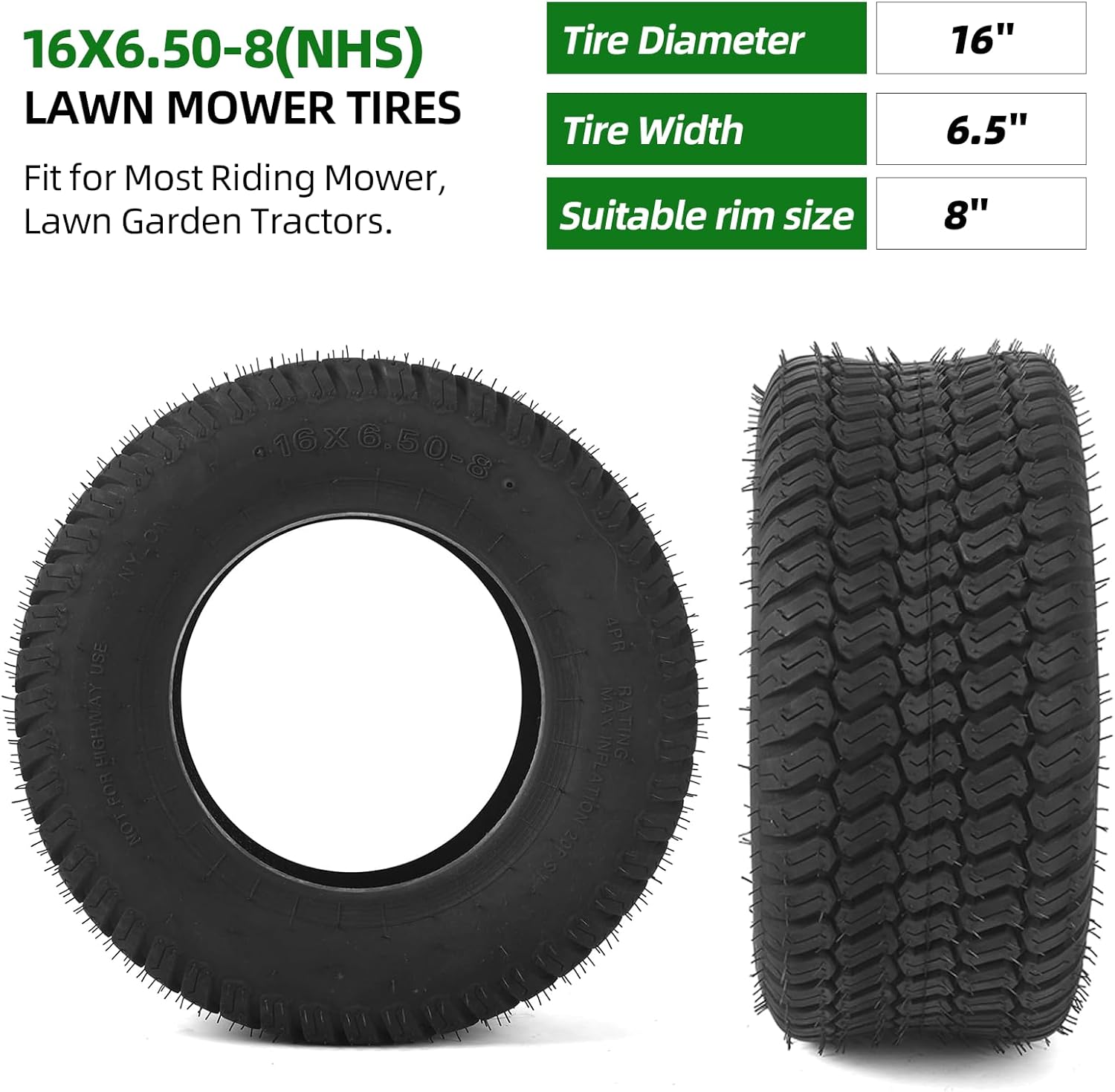 (2-Pack) 16x6.50-8 Tires - 4PR Durable Tubeless, Replacement Lawn Tractor Tires with Deep Ribbed Treads, Rim Not Included