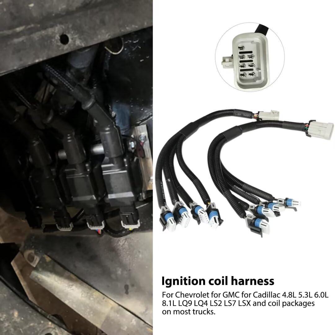 Direct replacement Ignition Coil Harness for the CHEVY GMC CADILLAC 4.8L 5.3L 6.0L 8.1L LQ9 LQ4 LS2 LS7 LSX and the coil packs found on most Trucks. The stock harness often get hard and brittle over time. Replace your harness with our new harness kit.