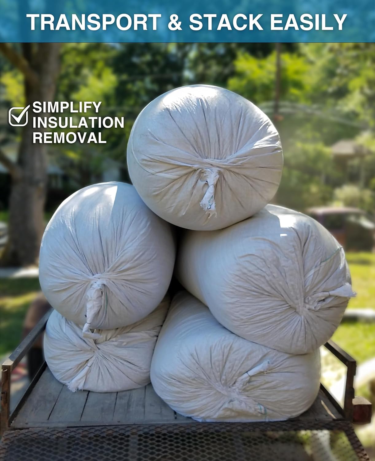 Bulldog insulation removal bags are the perfect size to maximize efficiency for your removal jobs. They hold a whopping 105 Cubic Feet and up to 400 lbs of removal material. The bags are manufactured so that they move and stack easily.