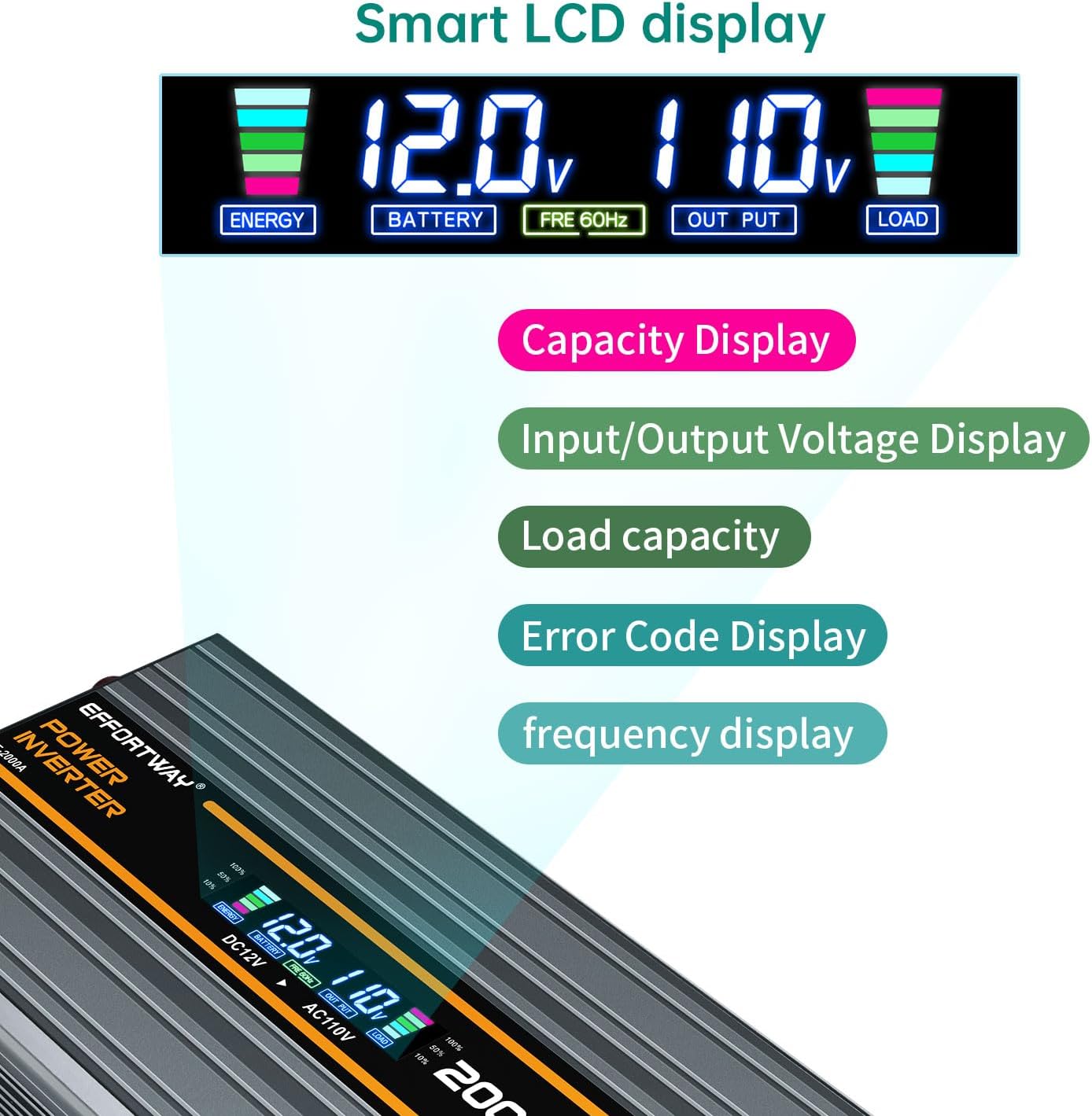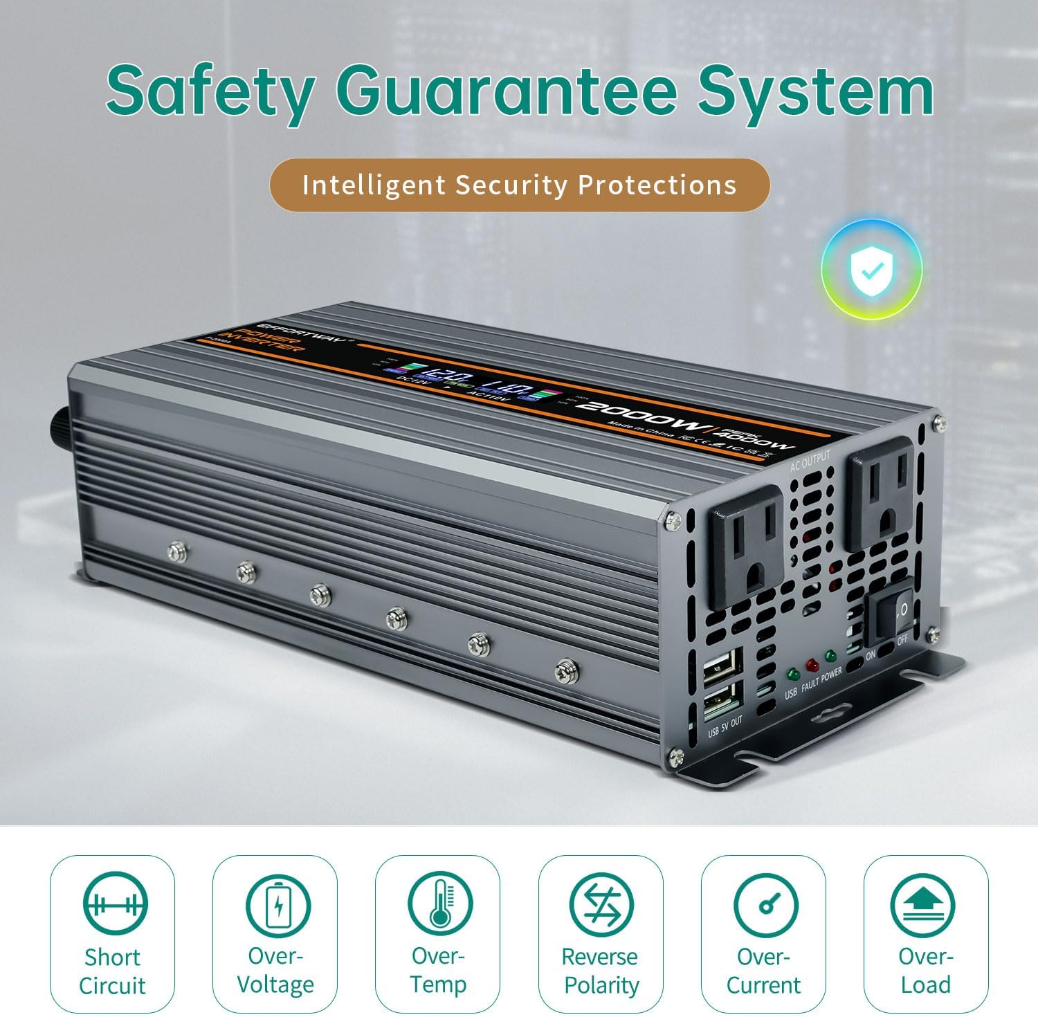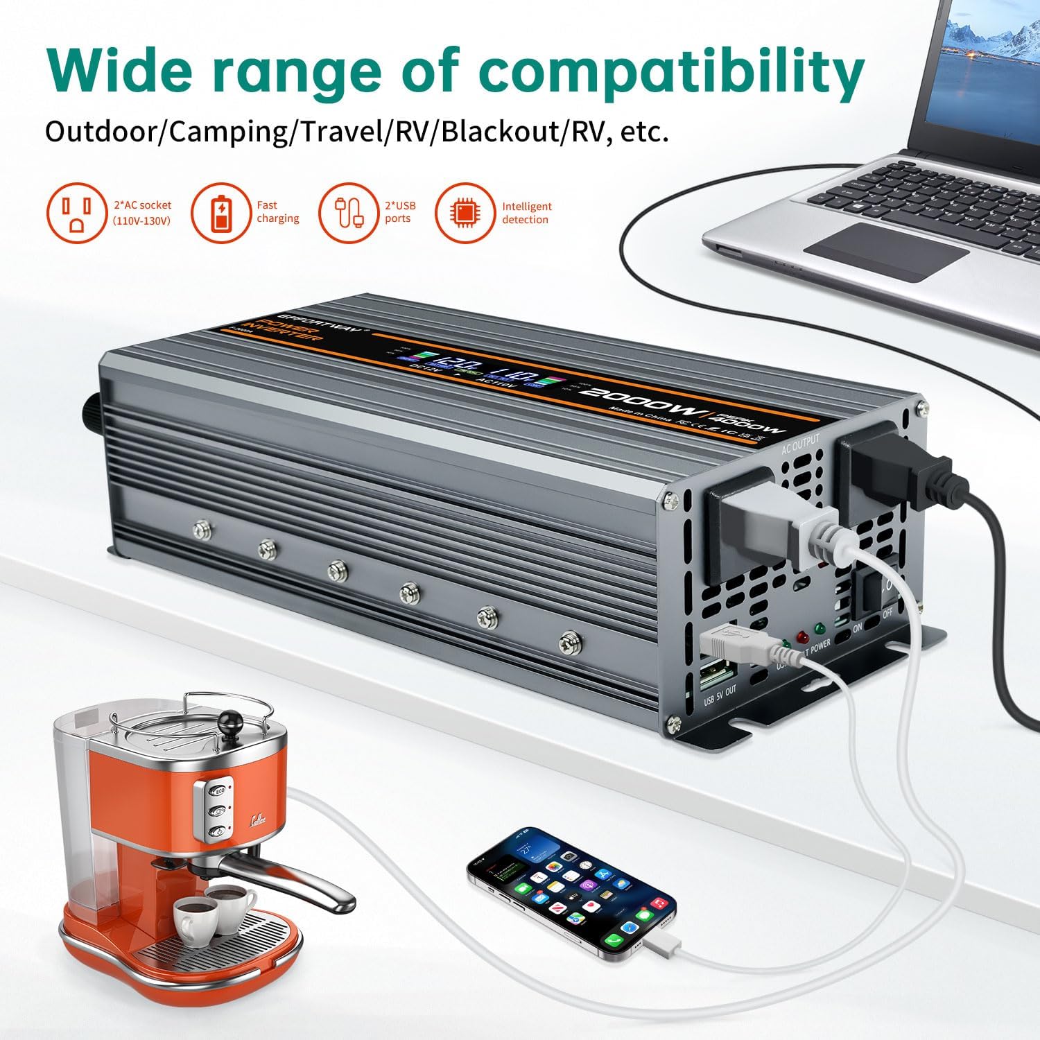 2000W Power Inverter 4000W (Peak). 12V DC to 110V/120V AC Converter with LCD Display, 2 AC outlets, 2 USB, 2000w Inverter for Camping RV Travel Outdoor Truck Off-Grid Solar inverters