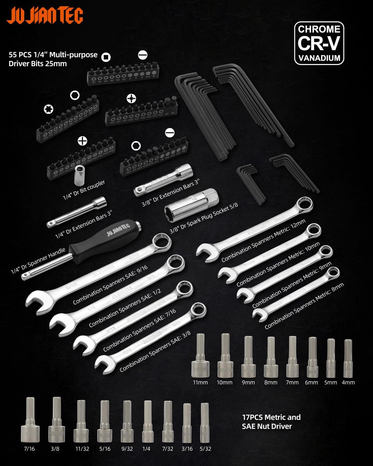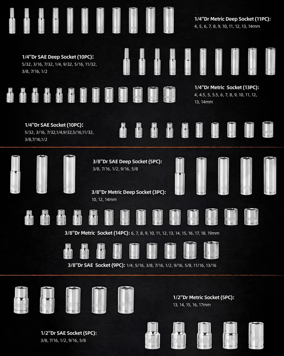 201-Piece Mechanics Tools Set, SAE & Metric Impact Socket Set, 1/2'', 1/4'', 3/8'' Drive, with Ratchet Wrench & Extension, Premium CRV Alloy Steel, with Molded Case