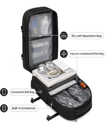 Capable of storing 18-20 spring garments and reducing storage space by over 50% (even more for down jackets). When fully expanded, the backpack achieves an impressive 60L capacity, comparable to a 21-inch suitcase.Ensuring you avoid extra baggage fees and enjoy hassle-free airline boarding