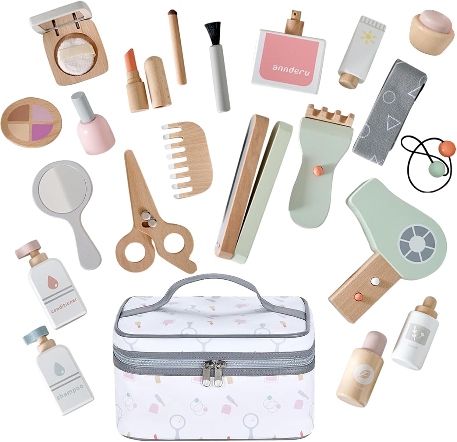 22 PCS Wooden Makeup Toy Set for Toddler Pretend Play,Wood Beauty Salon Toys Cute Wooden Makeup Kit with Realistic Accessories Gift for Girls 3 4 5 6