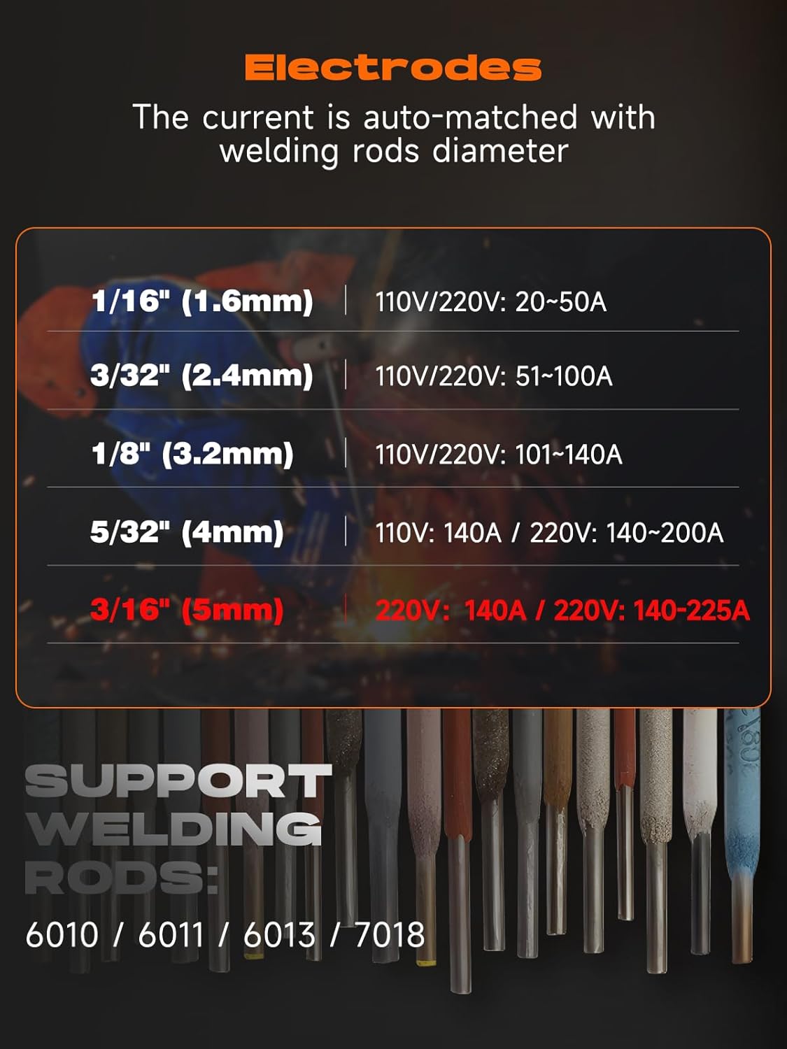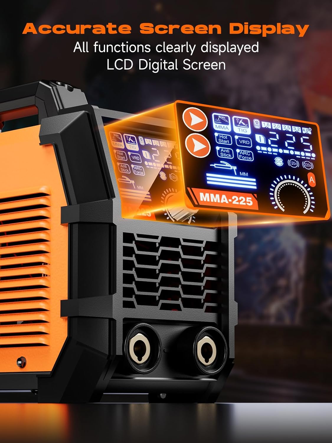 225 Amp Stick Welder with Large LCD Display, Digital IGBT Inverter, 110V/220V Portable Stick Welding Machine. Features include Dual Voltage, Hot Start, Arc Force, Anti-Stick, and VRD Protection