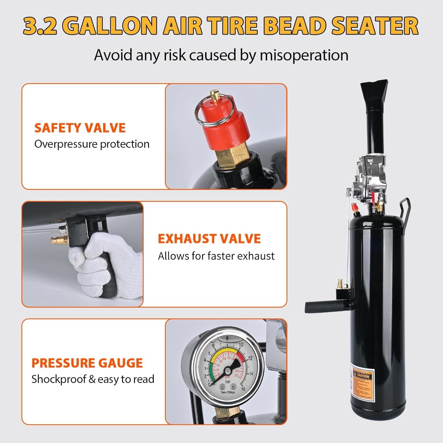 3.2Gal/12L Tire Bead Seater, 145 PSI Portable Bead Blaster Tire Inflator, Handheld Trigger Seating Inflator for Tractor, Truck, ATV, Car & Auto Repair, Black