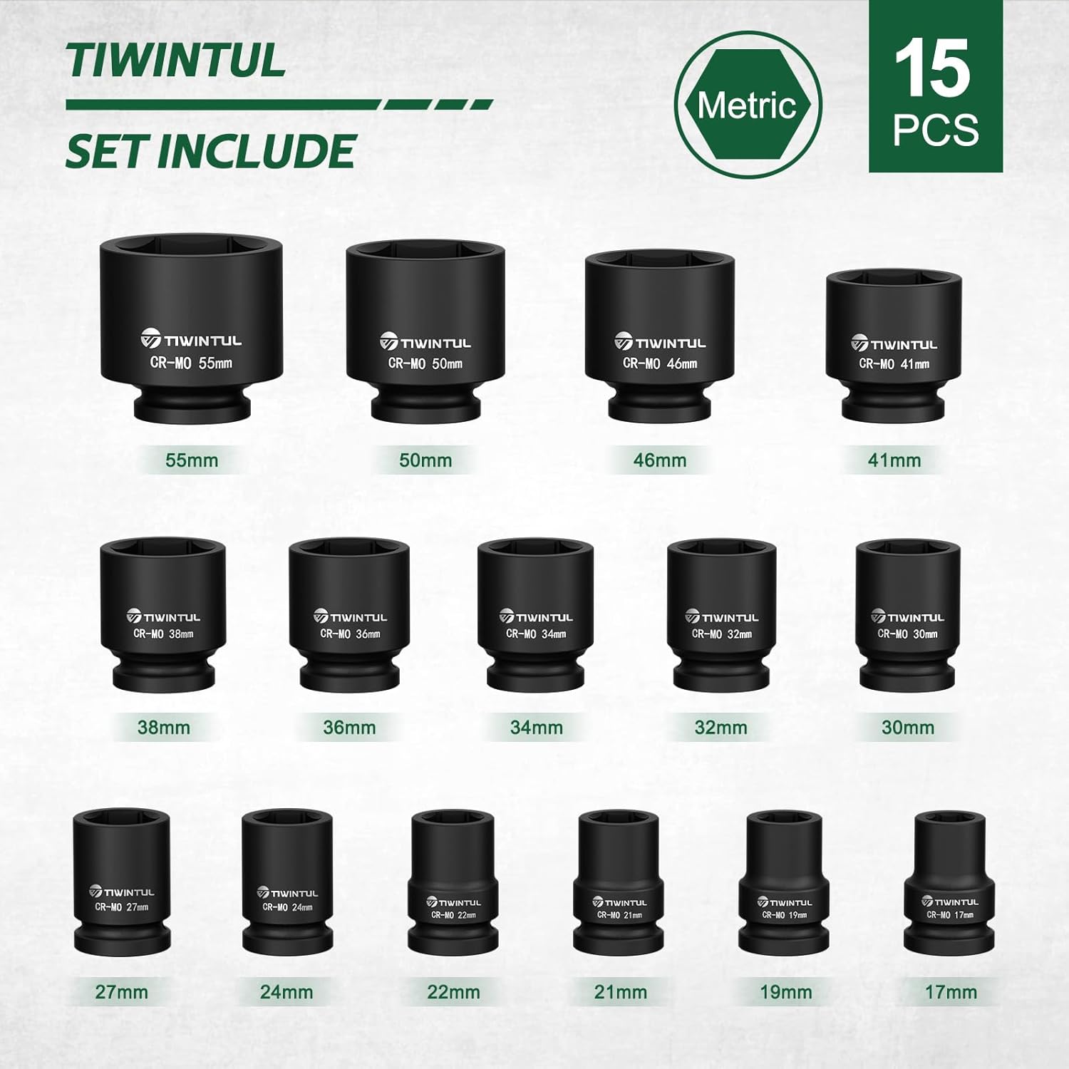 3/4 Inch Drive Impact Socket Set, 15 Pieces Heavy Duty 6-Point CR-MO Steel Impact Sockets, Metric Sizes 17-55 mm, Impact Socket Set for Auto, Truck and Large Machinery Maintenance
