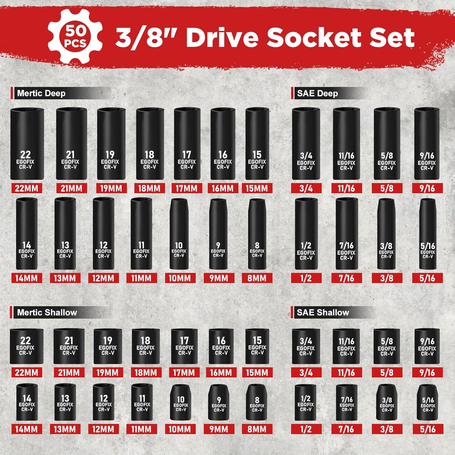 3/8" Drive Impact Socket Set, 50 Piece Standard SAE (5/16 to 3/4 inch) and Metric (8-22mm) 6 Point, with Adjustable Ratchet Handle, Extension Bars, Impact Universal Joint, Adapter, Cr-V Steel