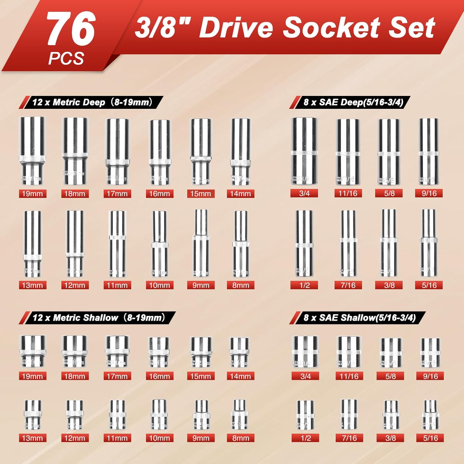 3/8” Drive Socket Set, 76 Pieces Ratchet Wrenches Set, Standard and Deep Metric (8 to 19mm)/SAE (5/16 to 3/4 inch) Size, with 72-Tooth Ratchet for Auto Repairing and Household, with Storage Case