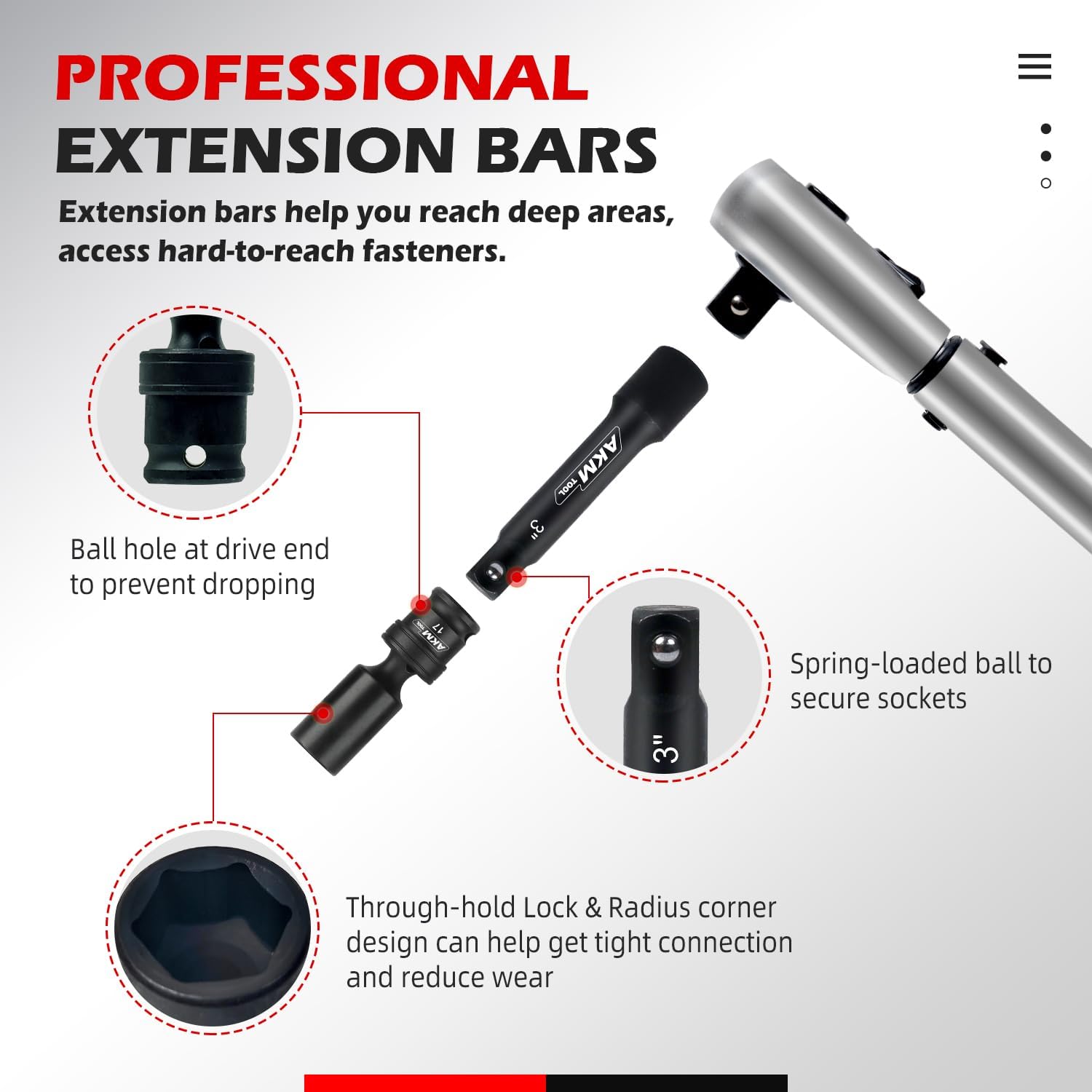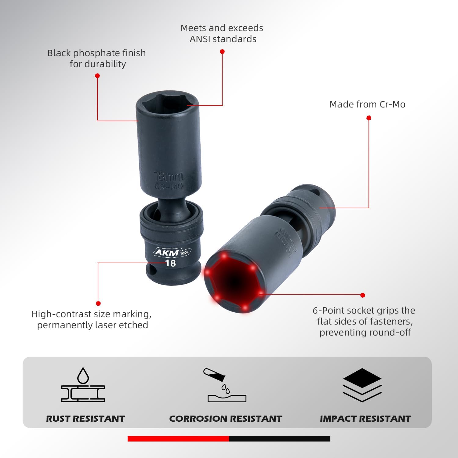 3/8" Drive Universal Impact Socket Set, 17 Piece Swivel Socket Set, Universal Joint Wobble Socket 6-Point, Metric, 8-19mm, Cr-Mo, with Extension Bars, Socket Adapter, Drill Bit Adapter