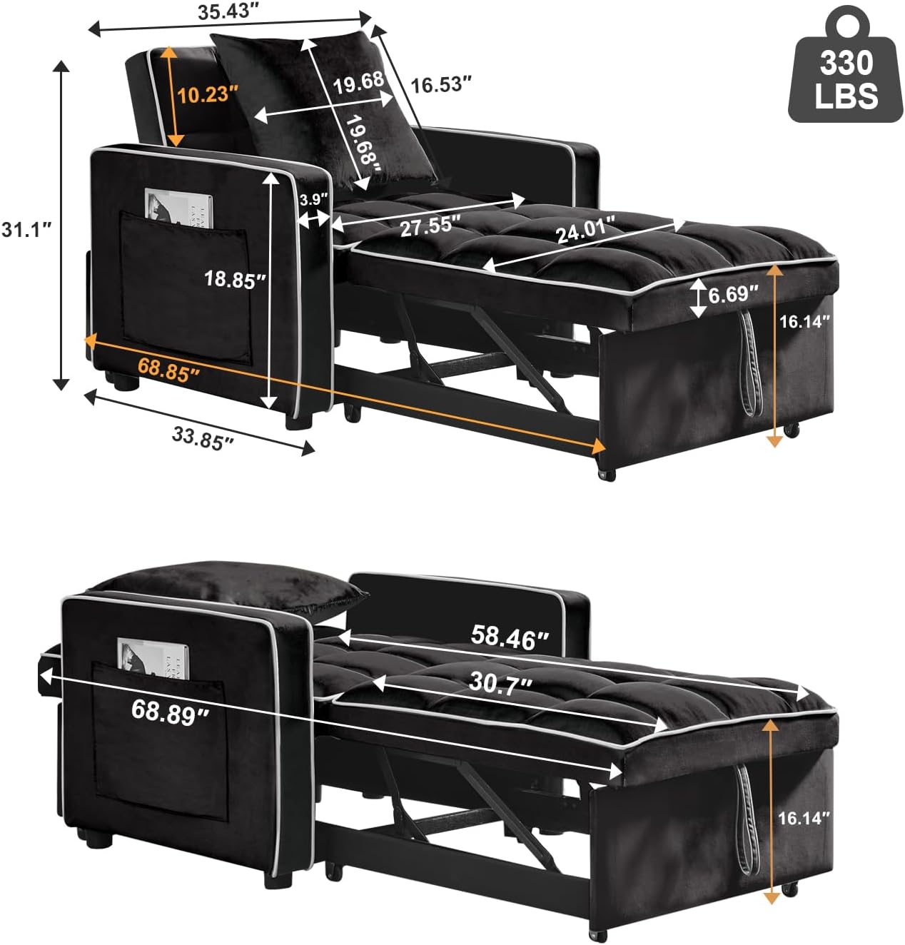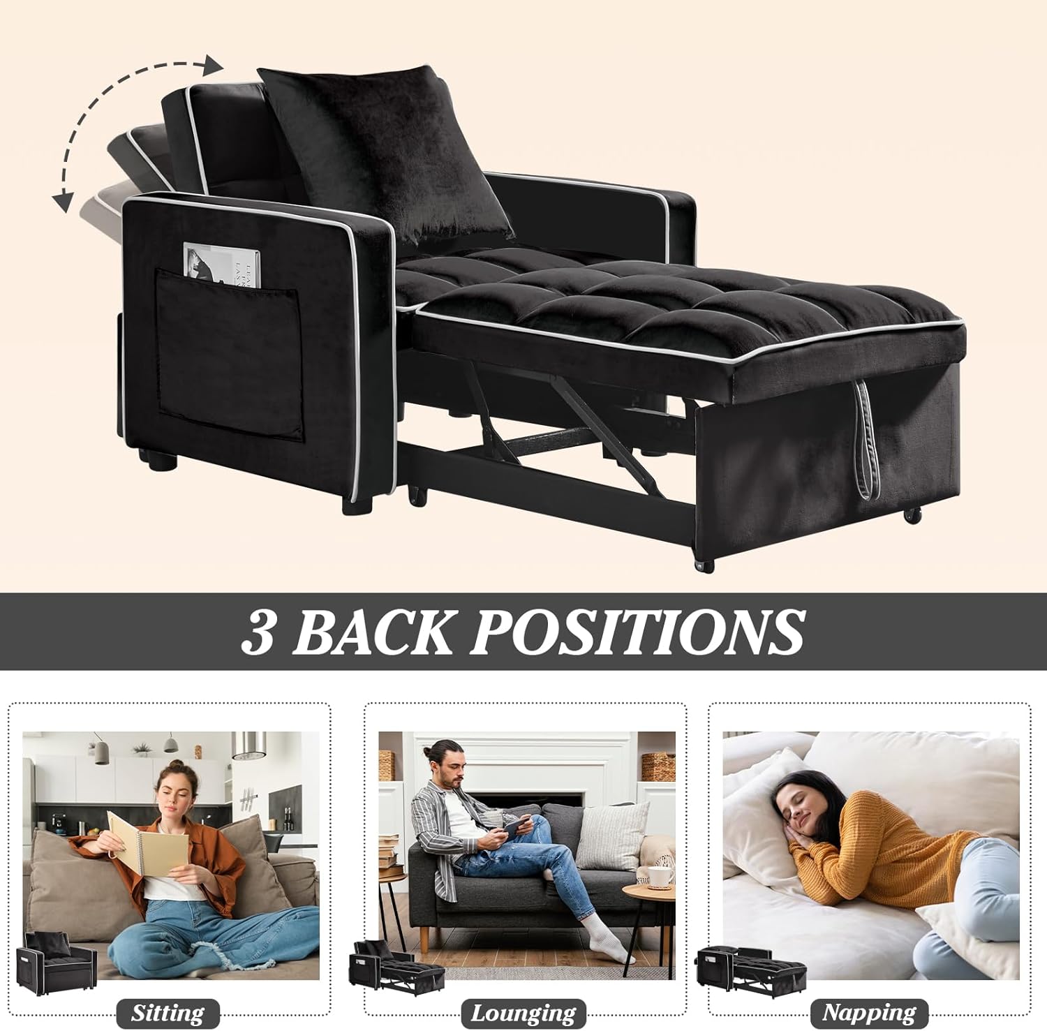 3 in 1 Single Convertible Sleeper Sofa Chair, 35.4" Pull Out Sofa Bed with Adjustable Backrest, Modern Chaise Lounge with Storage, Sleeper Chair Bed with Pillow for Living Room (1, Black)
