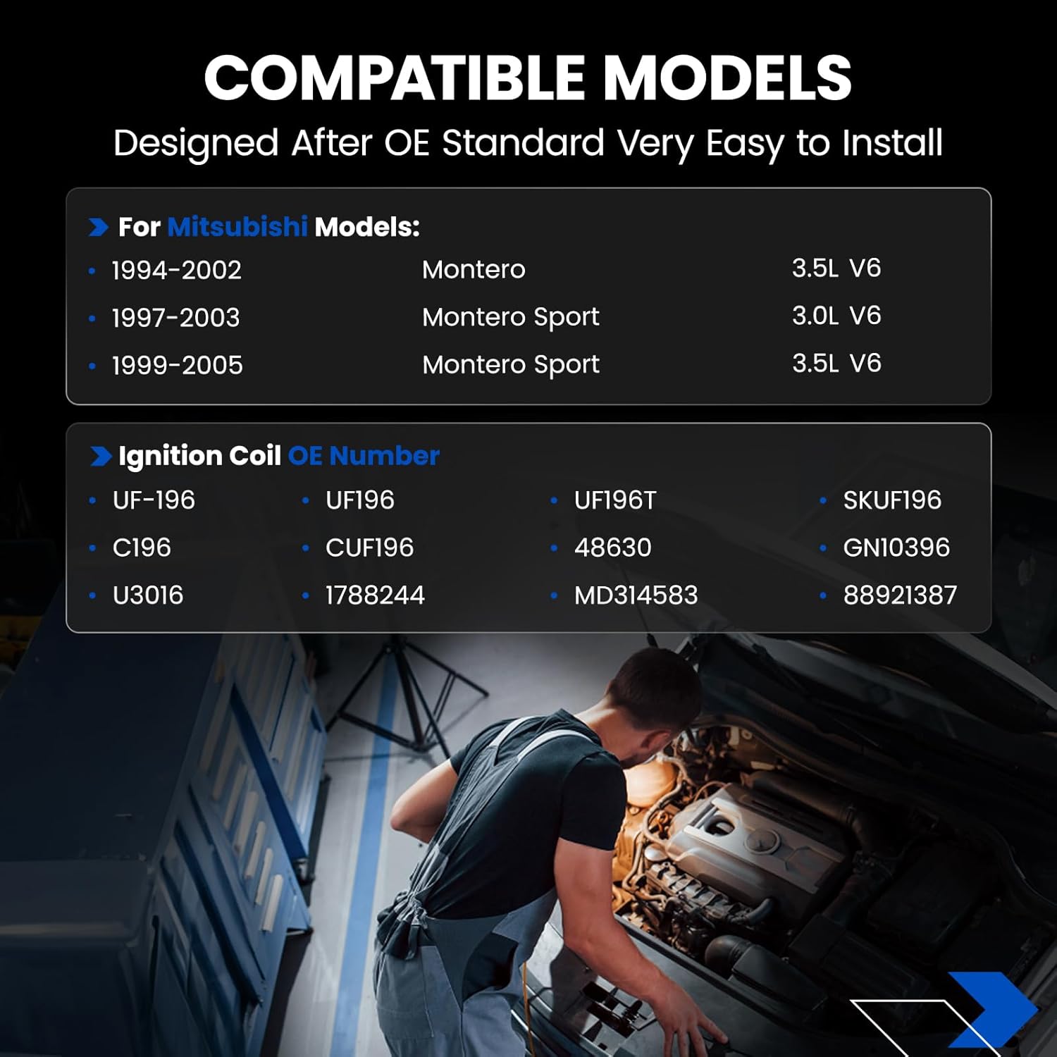 3-Pack UF196 Ignition Coils Compatible with Mitsubishi Montero 1994-2002, Compatible with Mitsubishi Montero Sport 1997-2005, 3.0L 3.5L V6 - Replaces MD314583 1788244 C196
