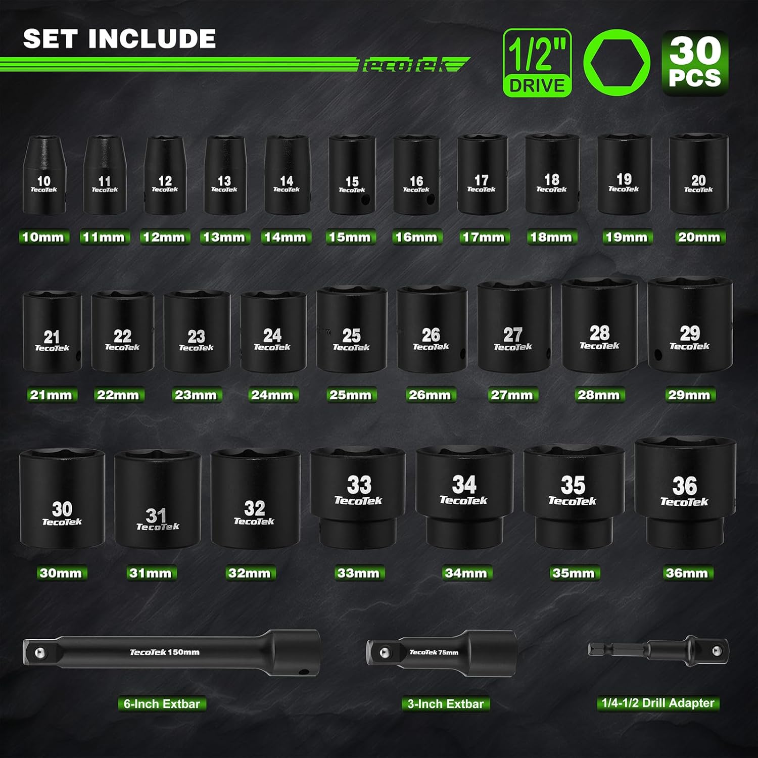 30 Pieces 1/2-Inch Drive Shallow Metric Impact Socket Set, Cr-Mo, 10mm to 36mm, No Skipped Sizes, 6 Point, Includes Extension Bars, Drill Socket Adapter 1/2"