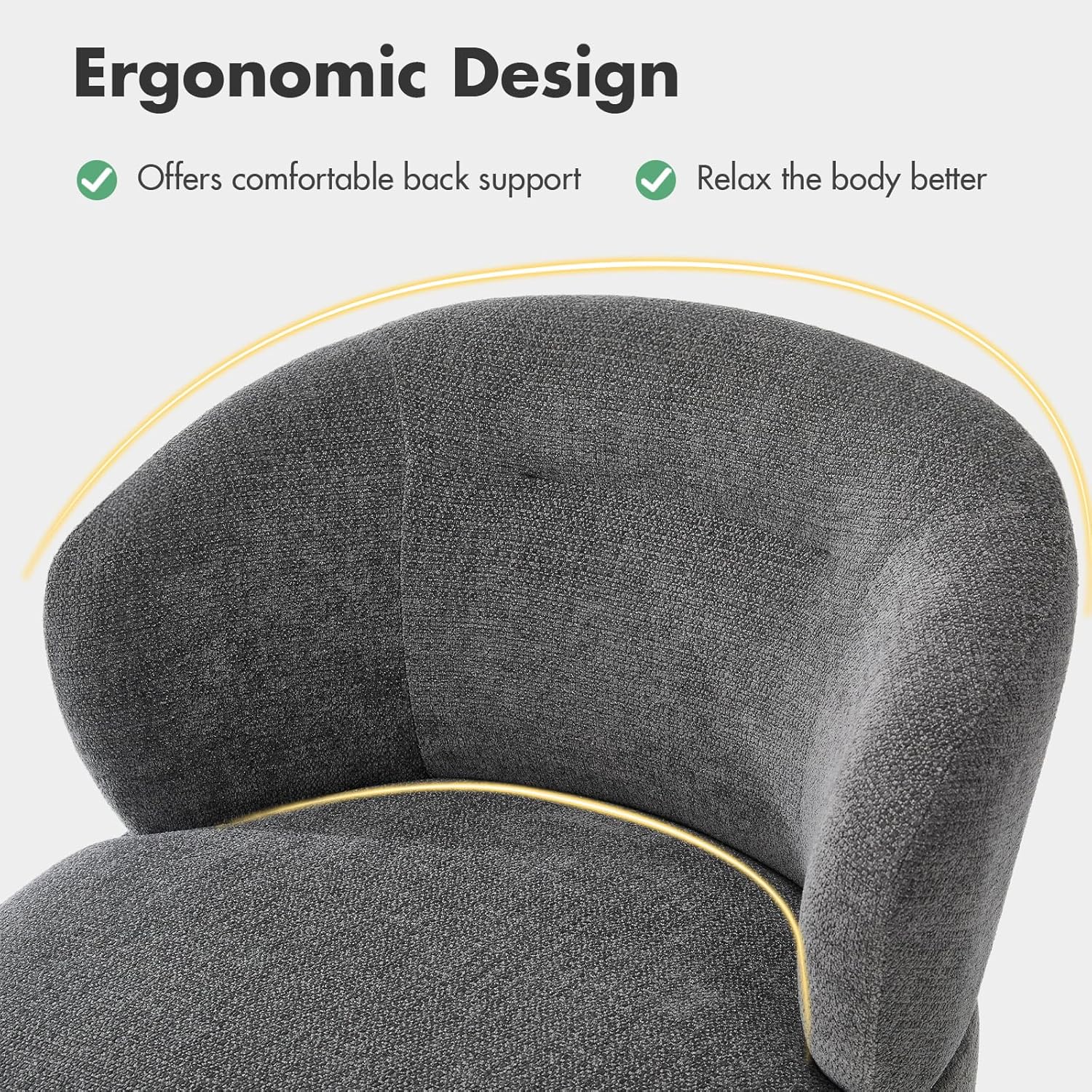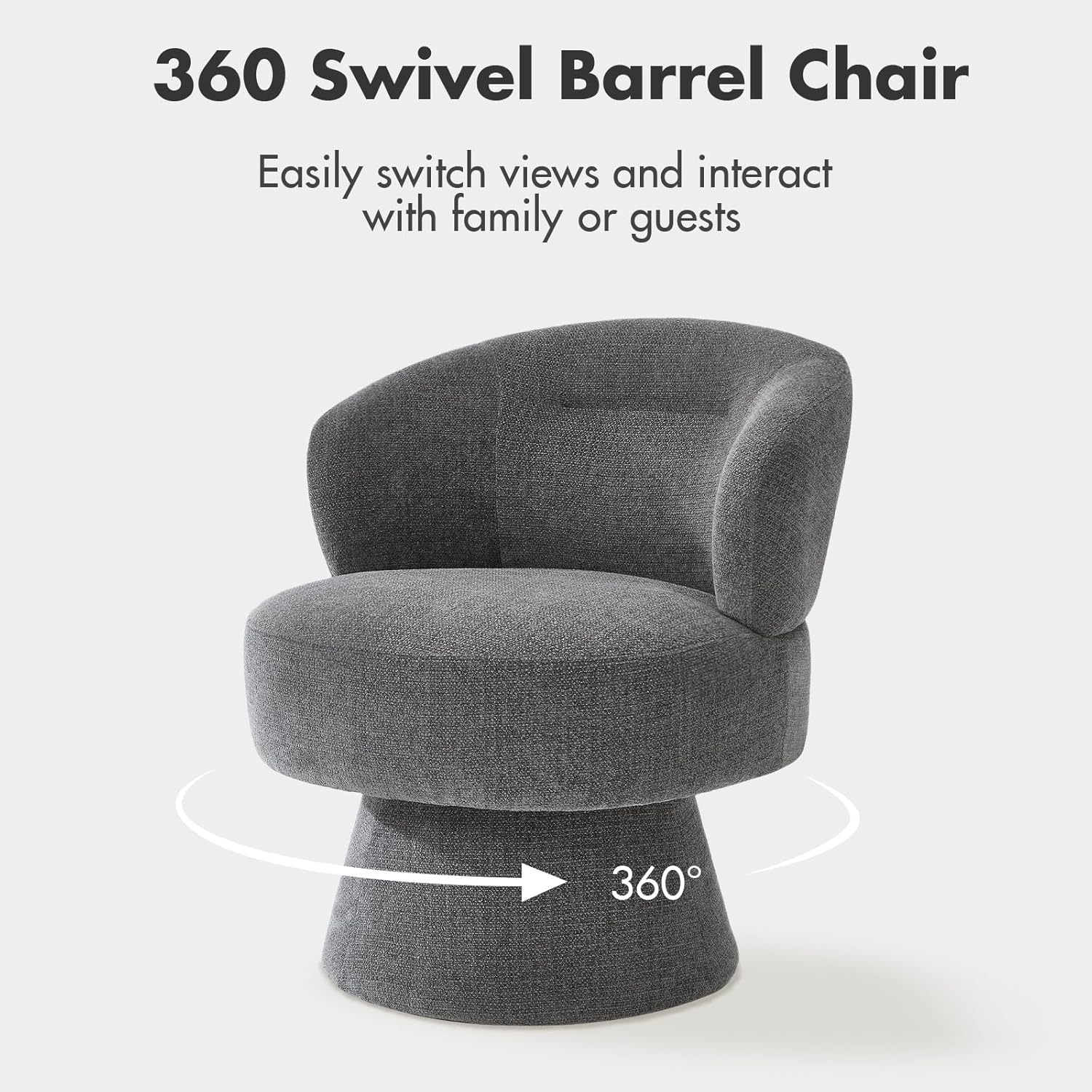 This modern swivel dining chair has a compact, boucle-inspired design ideal for small spaces. Smooth 360-degree rotation allows easy posture adjustment without standing, making it convenient to switch views and interact with family or guests, enhancing comfort and usability. Versatile and functional, it works as a vanity chair, reading chair, or accent chair, and fits well in bedrooms, balconies, living rooms, dressing rooms, and small apartments. The chair features soft chenille fabric and high-density sponge padding for a comfortable seating experience, while its ergonomic backrest supports the spine and promotes relaxation. Built with a stable circular rotating base and solid wooden frame, it supports up to 300 lbs, ensuring durability and smooth performance. Installation is quick and easy, typically taking only 15–30 minutes. All necessary tools, hardware, and clear instructions are included.