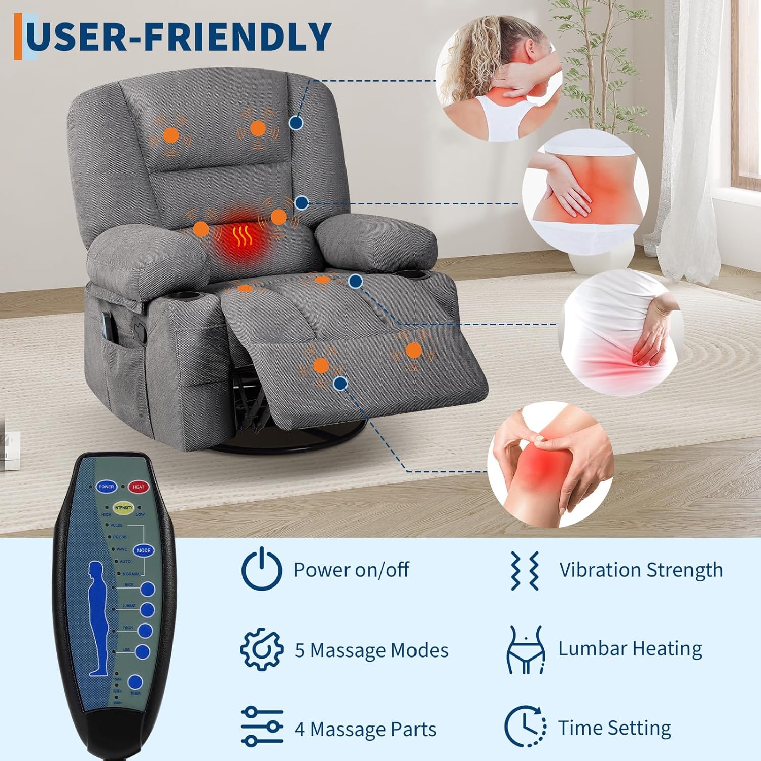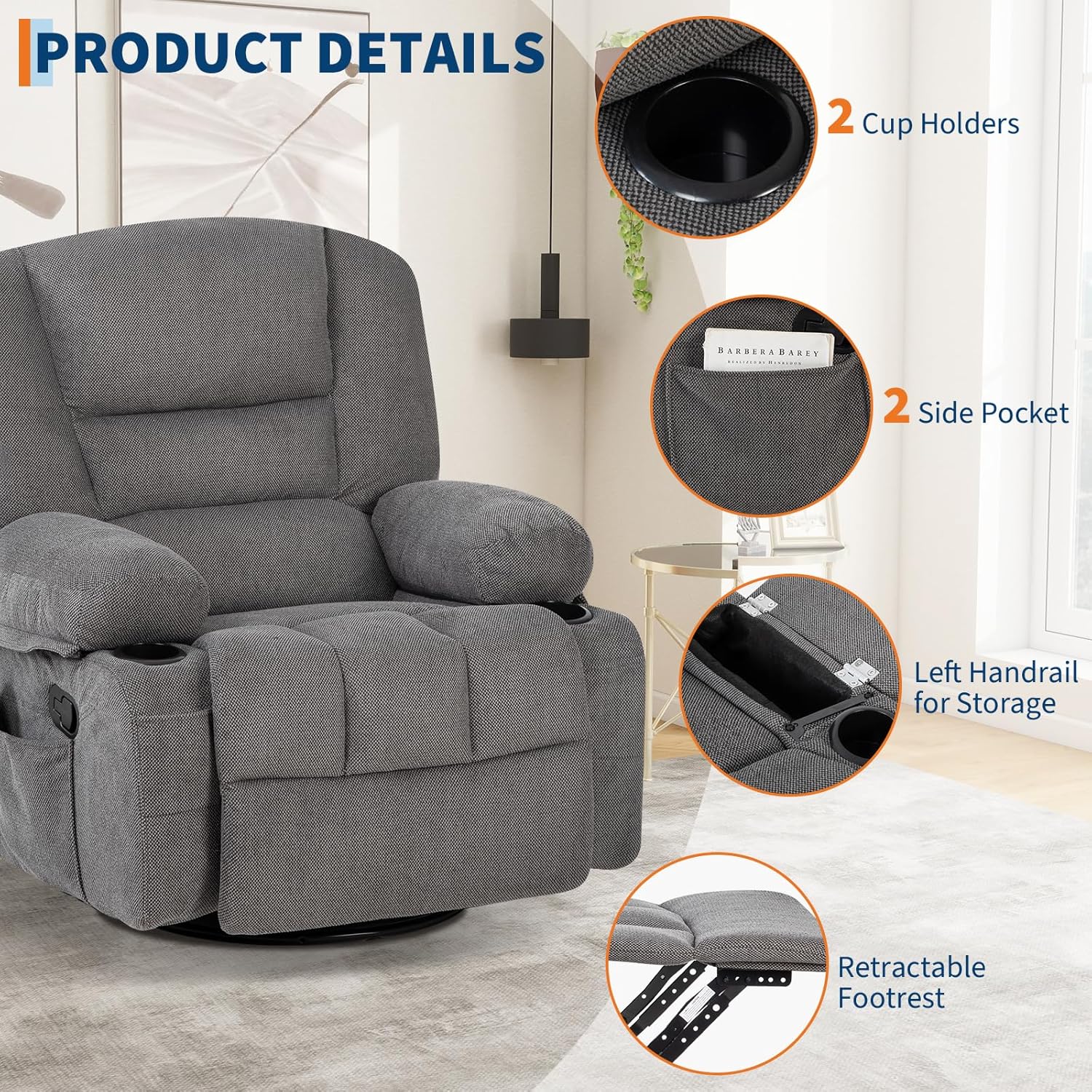 360° Swivel Recliner Chair with Heat & Massage, Widen Overstuffed Single Sofa Lounge Chair with Side Pockets Cup Holders for Living Room,Bedroom, RV, Gray
