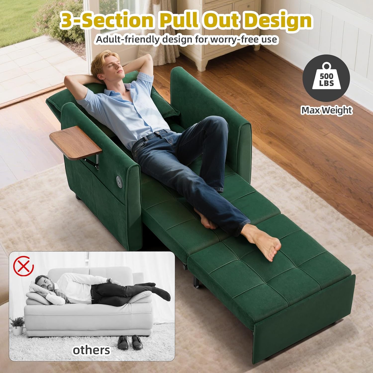 4-in-1 Convertible Sleeper Chair Bed for Adult, 90" Extra Long Pull-Out Sleeper Sofa Bed with Wing Table, USB Charging & Bottom Storage, Single Sleeping Chair for Living Room, Green