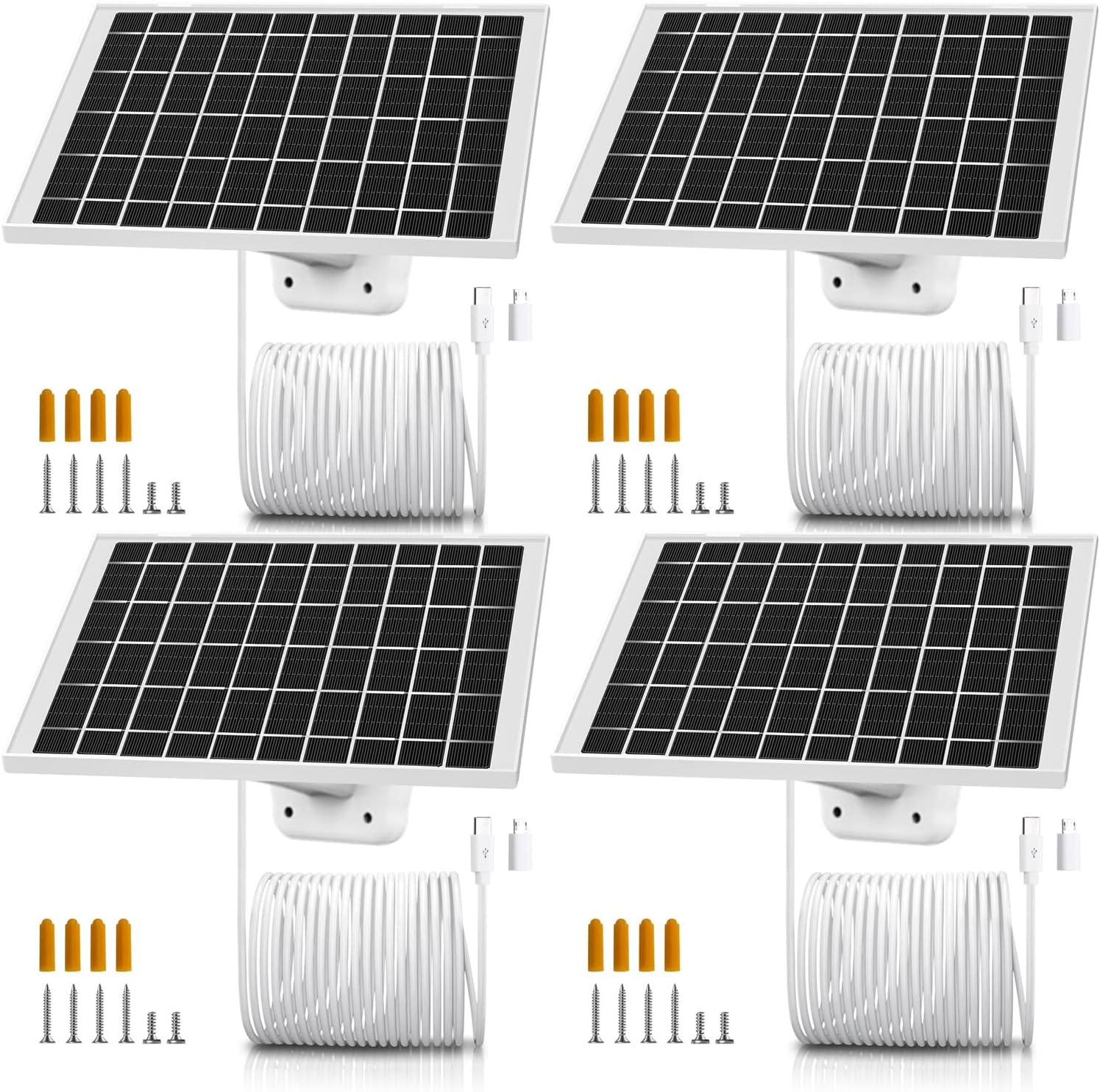 4 Pack USB Solar Panel Charger Wide compatibility : Designed for Outdoo security Camera using the built-in USB-C connector. 5V DC output to meet a variety of device requirements.
