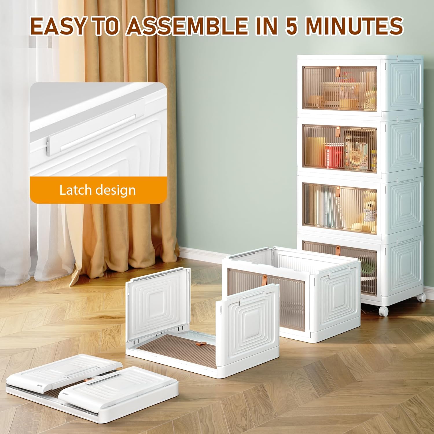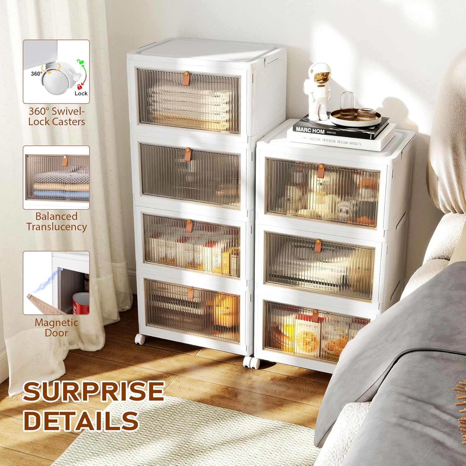 4 Tier Storage Bins with Lids, 23QT Stackable Closet Organizers and Storage with Wheels, Collapsible Storage Boxes, Foldable Plastic Storage Containers for Home,Office, Dorm Room-White