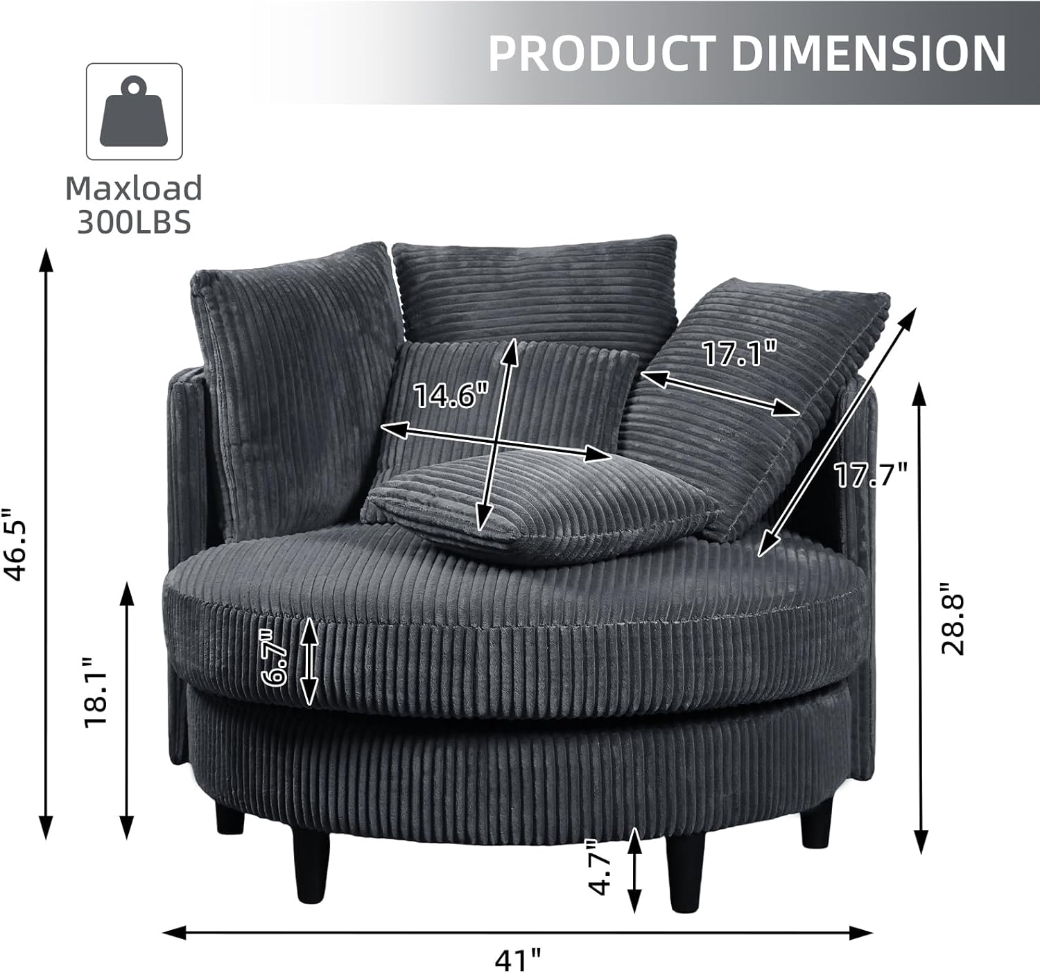 41" Oversized Accent Barrel Chair Large Round Chair, Modern Upholstered Circle Accent Chair with Legs & 5 Pillows for Living Room, Bedroom, Corduroy Chair, Grey