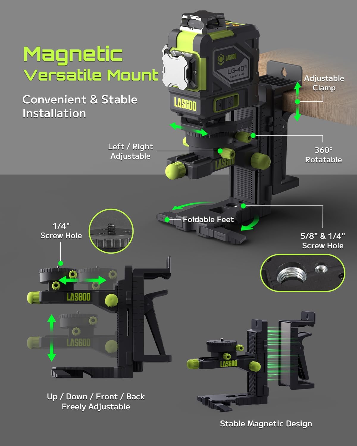 4x360° Self-Leveling Laser Level, 16 Lines Green Cross Line Laser, for Construction Projects and Home Decoration, with 2 Rechargeable Li-Ion Batteries and Magnetic Bracket, LG-4Ds