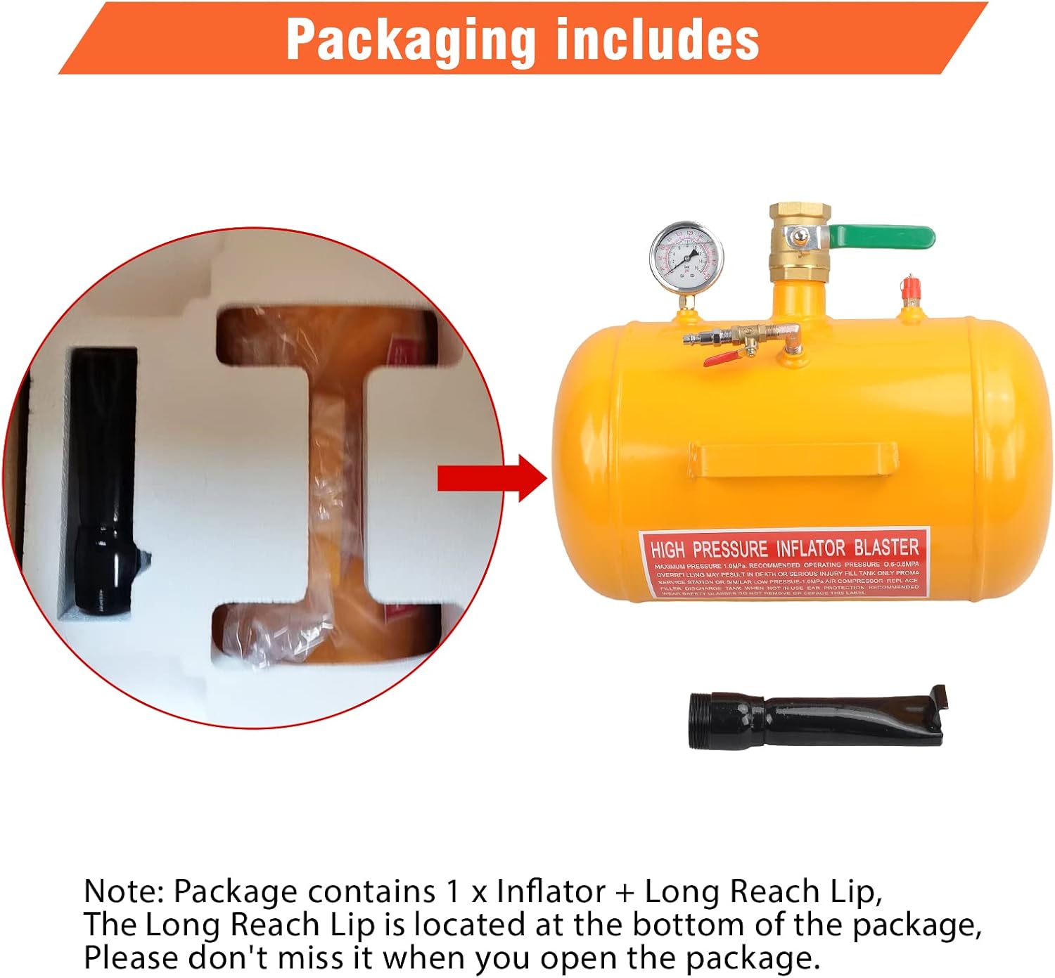After putting the high pressure tube correctly to the gap between the tire and the wheel rim and turn ON the valve, quickly inflates tire sidewall to seat the bead onto wheel rim for all tires up to 24.5 inch and then turn OFF the valve. (Before air inflation, please wear the ear and eyes protector). Different vehicles needs different level operating pressure. Gauge can help you accurately read and adjust pressure for various vehicles. The maximum pressure of inflator is 145PSI (1.0Mpa).