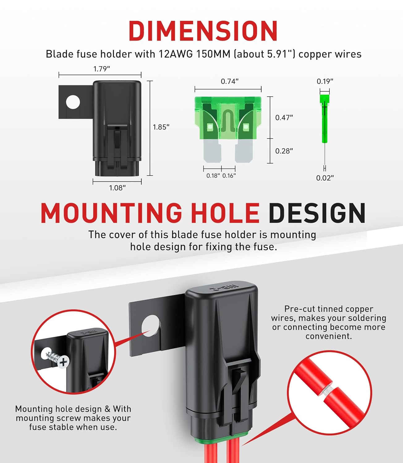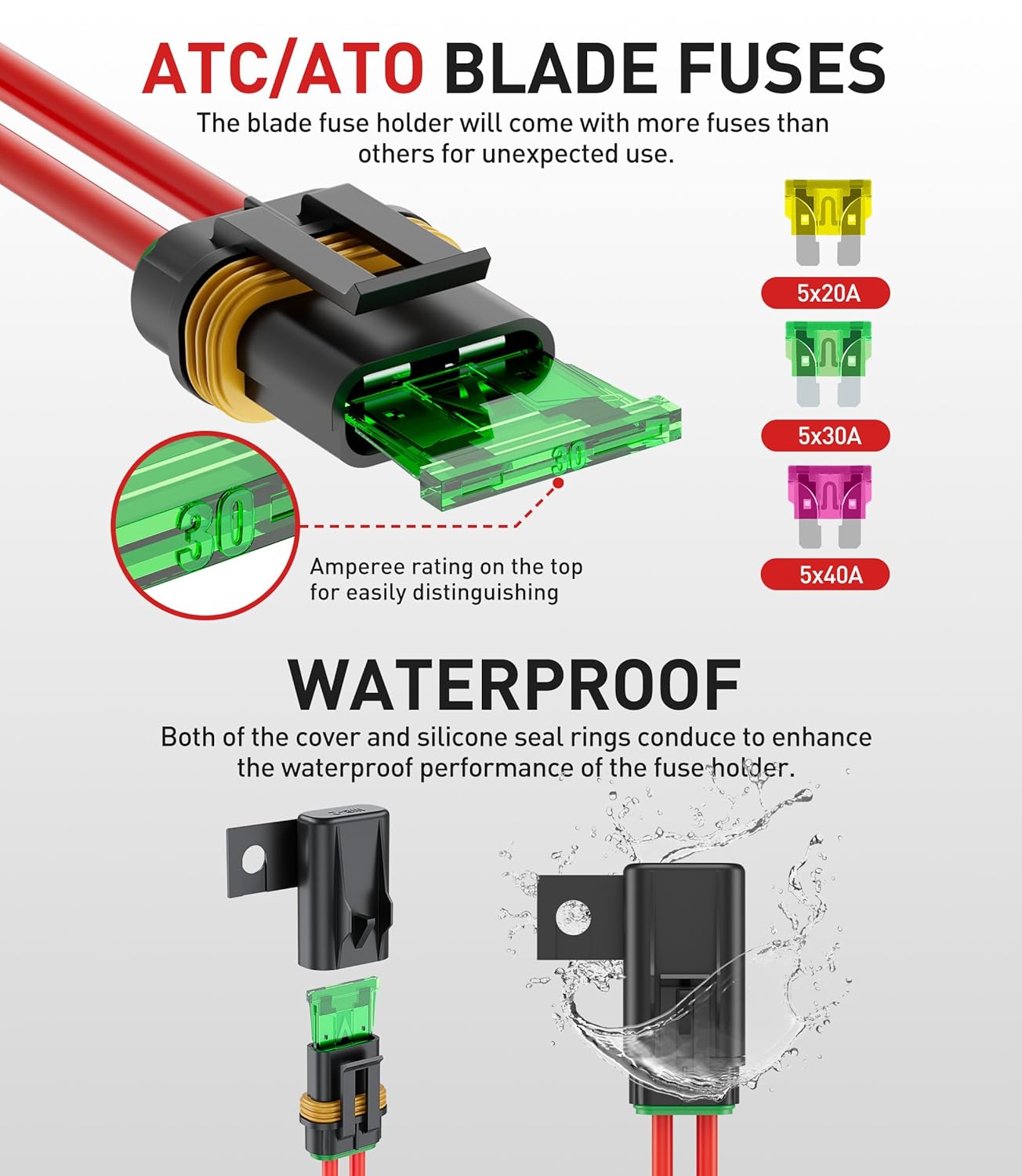 5 Pack 5-Pin Waterproof Relay Kit 40/30 AMP 12V Relay Switch with Harness Heavy Duty 12&16 AWG Tinned Copper Wires with 5x20A/30A/40A Inline Fuse SPDT for Automotive Car Marine Boat