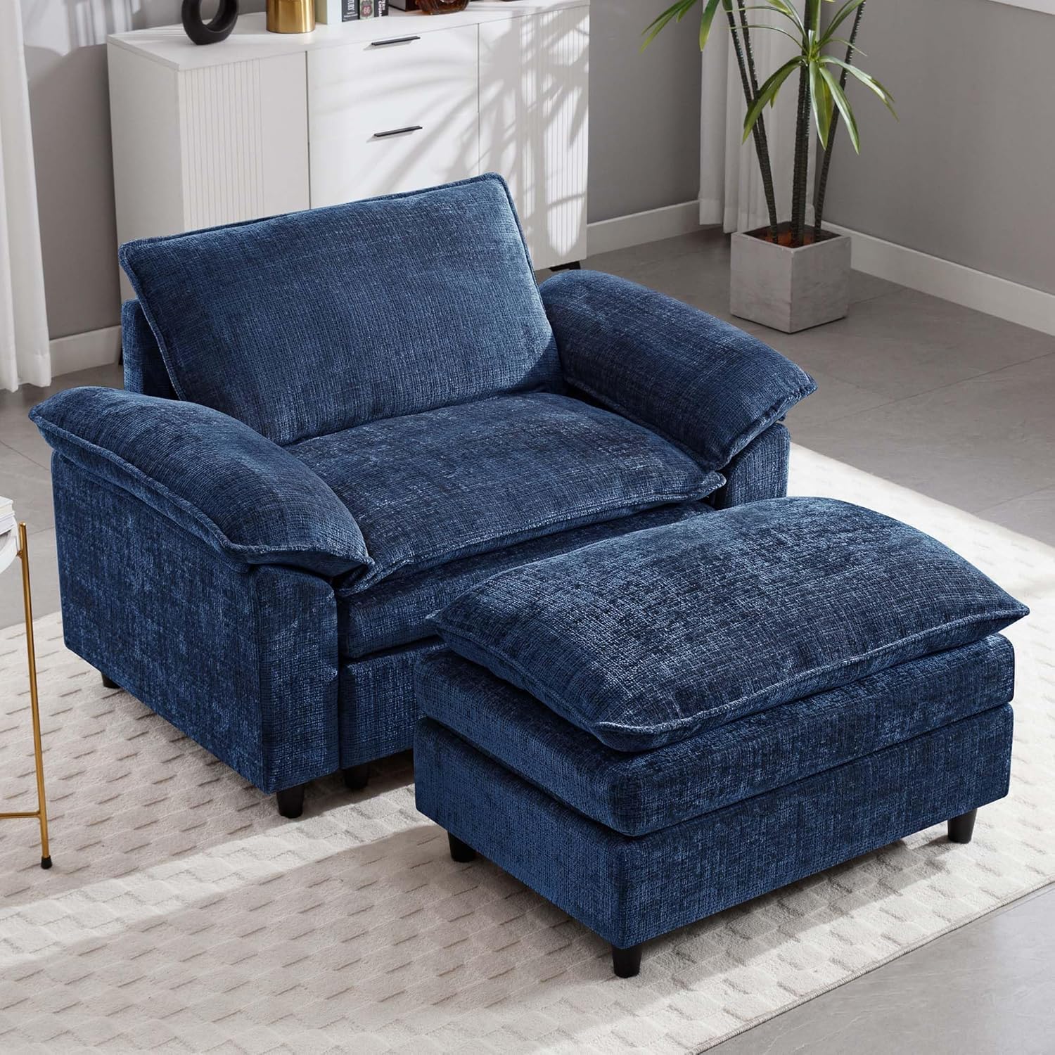 51.9" Blue Oversized Cloud Accent Chair with Ottoman, Modern Chaise Lounge Indoor, Comfy Chenille Single Sofa Couch Chair for Living Room Apartment Office