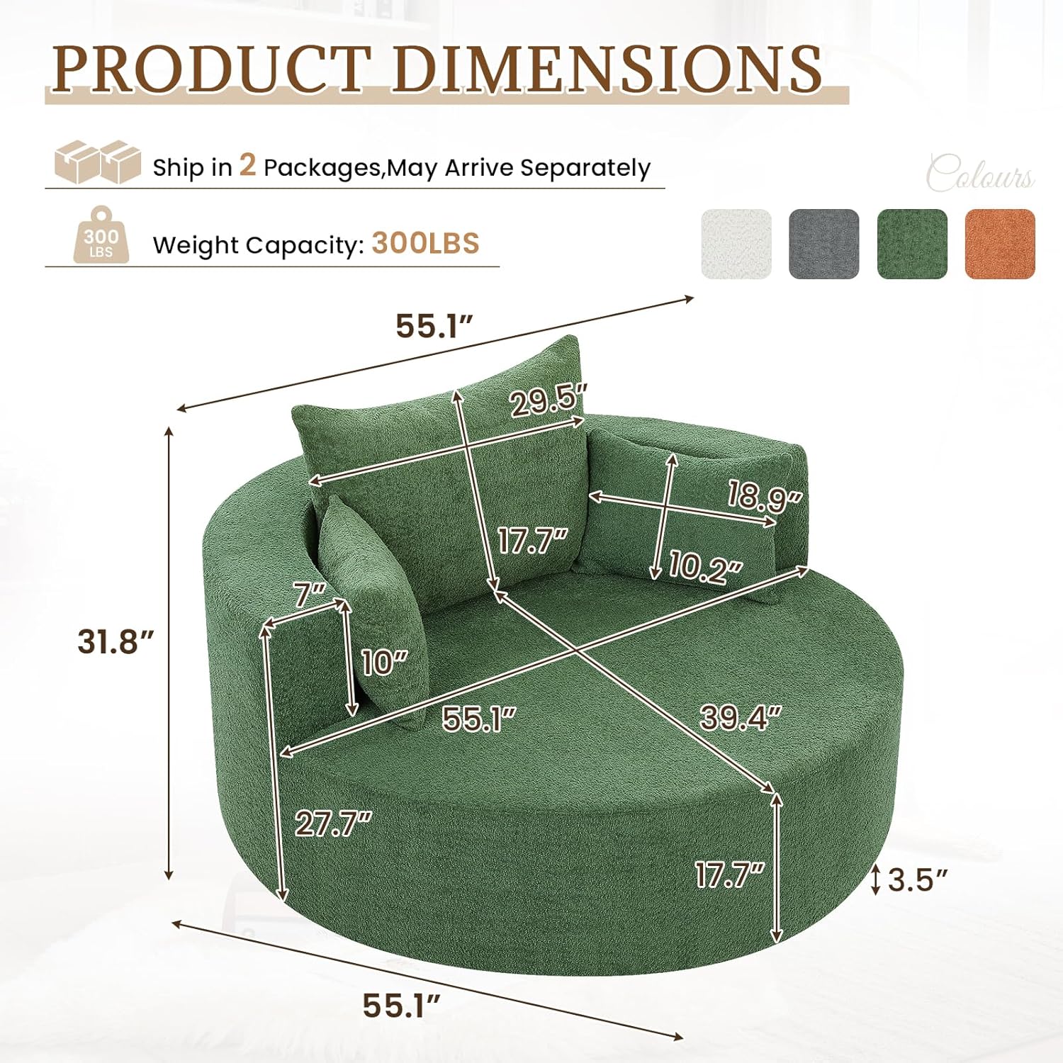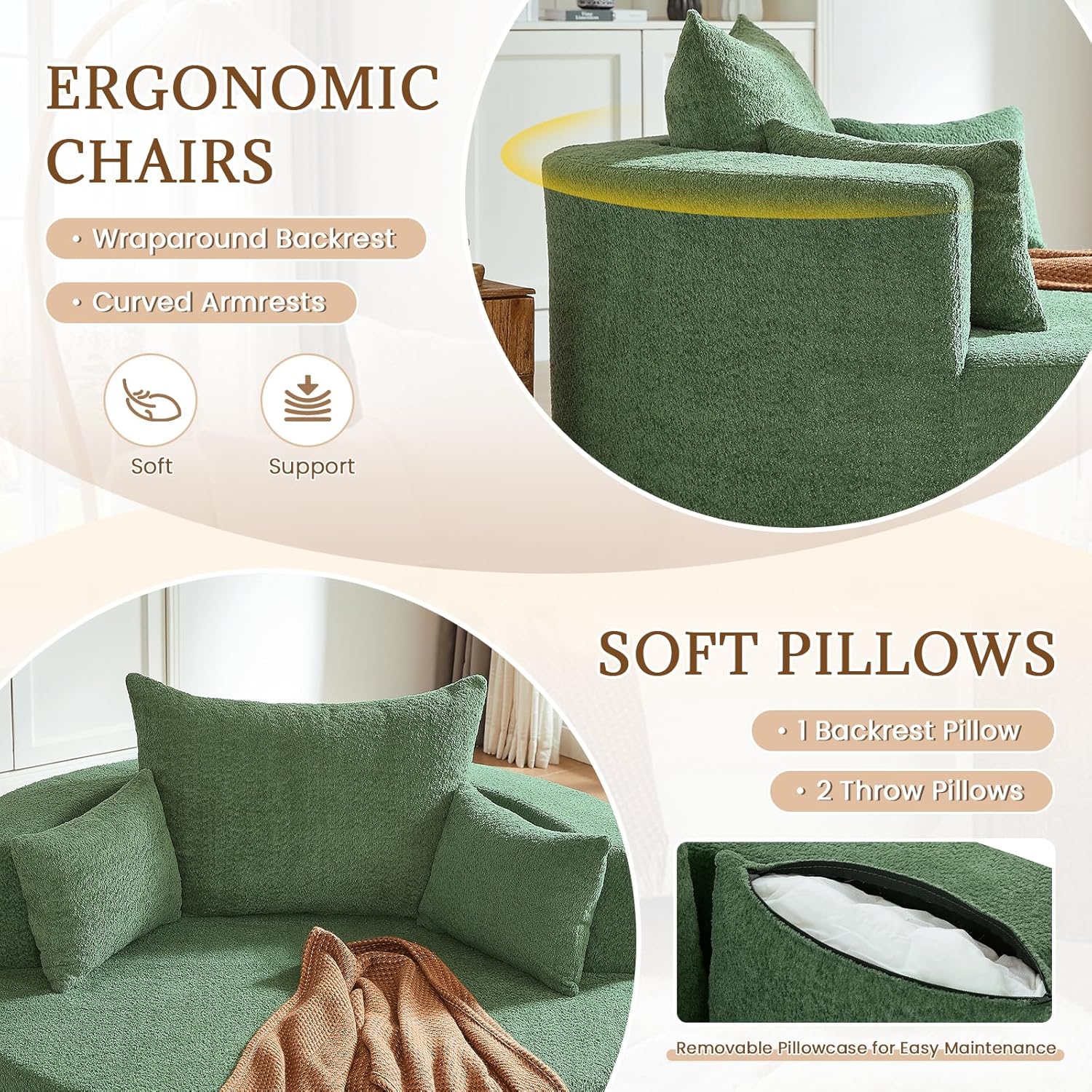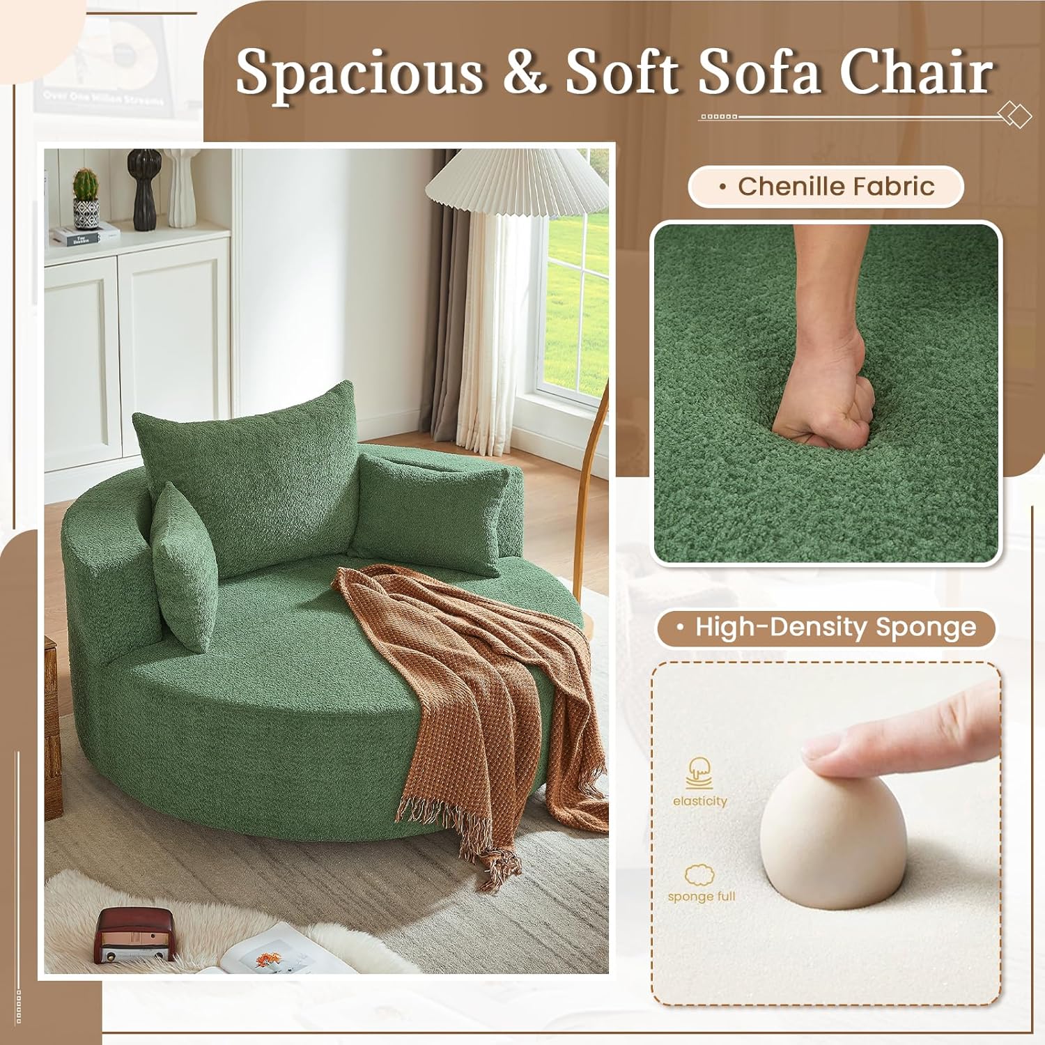 55.1” Oversized Round Swivel Barrel Chair, Large Upholstered Accent Sofa Chair with 3 Pillow, Comfy Chenille Cloud Circle Reading Chaise Lounge Indoor for Living Room, Bedroom,Apartment,Green