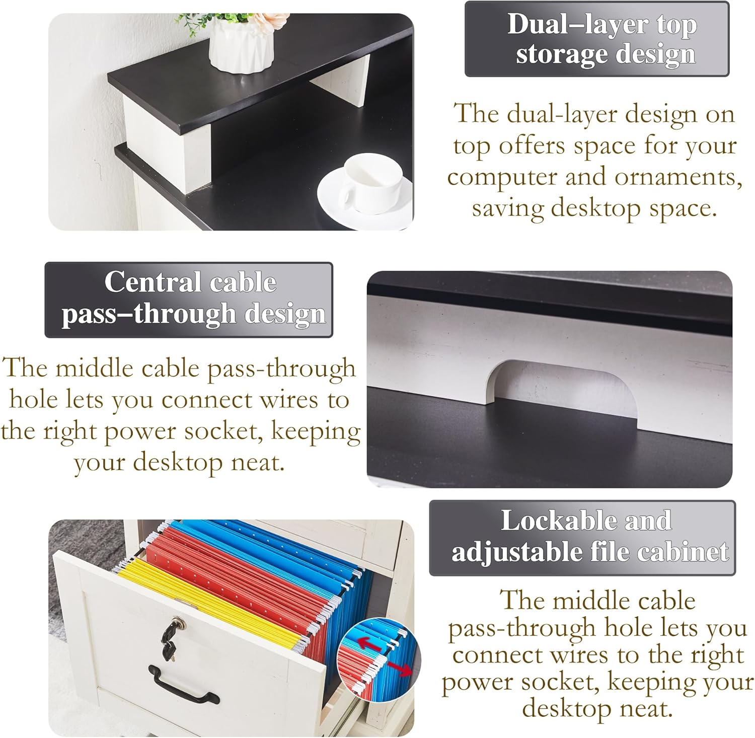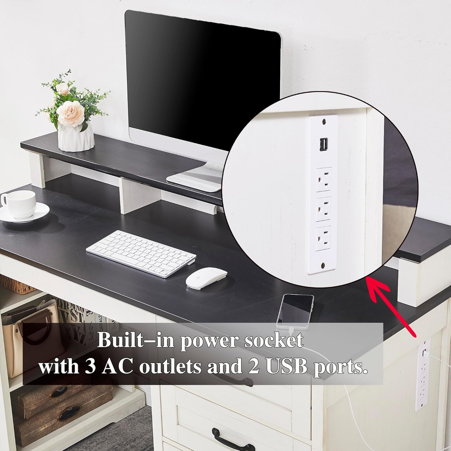 55" Farmhouse Executive Desk with Charging Station,Home Office Desk with 2 Drawers,Lockable File Cabinet and Side Bookshelf,Farmhouse Computer Desk with Monitor Stand
