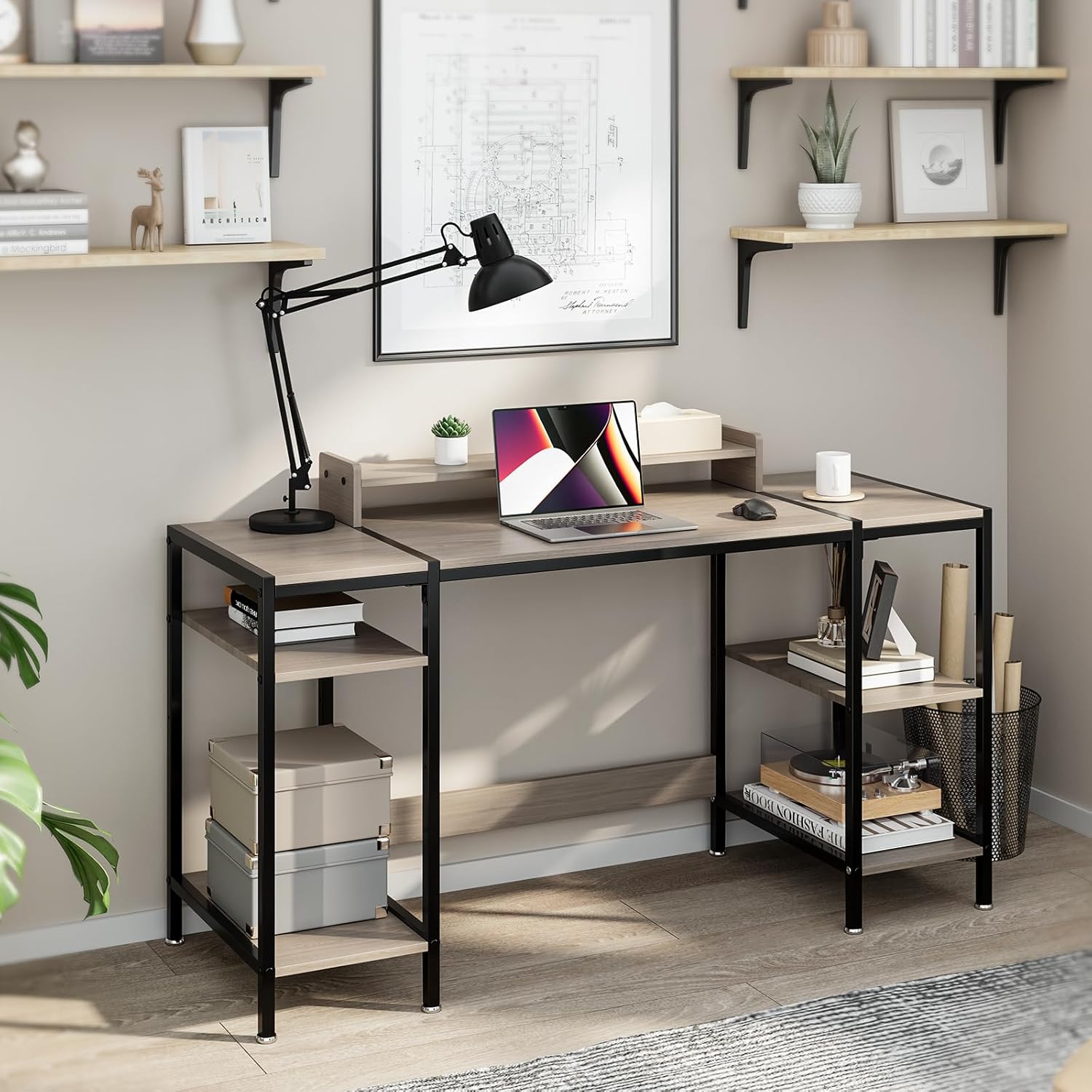 55 inch Grey Computer Desk Gaming Desk with Monitor Stand, Home Office Desk for 2 Monitors, Writing Desk with Adjustable Storage Space,Sturdy and Durable Modern Small Desk