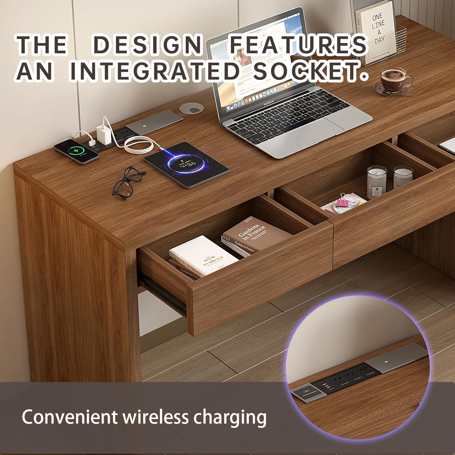 55-Inch Office Desk with Pull-Out Outlet, Computer Desk with 3 Sturdy Drawers, Writing/Gaming/Work/Study Desk for Bedroom, Living Room & Home Office, Brow (Brown, 55)