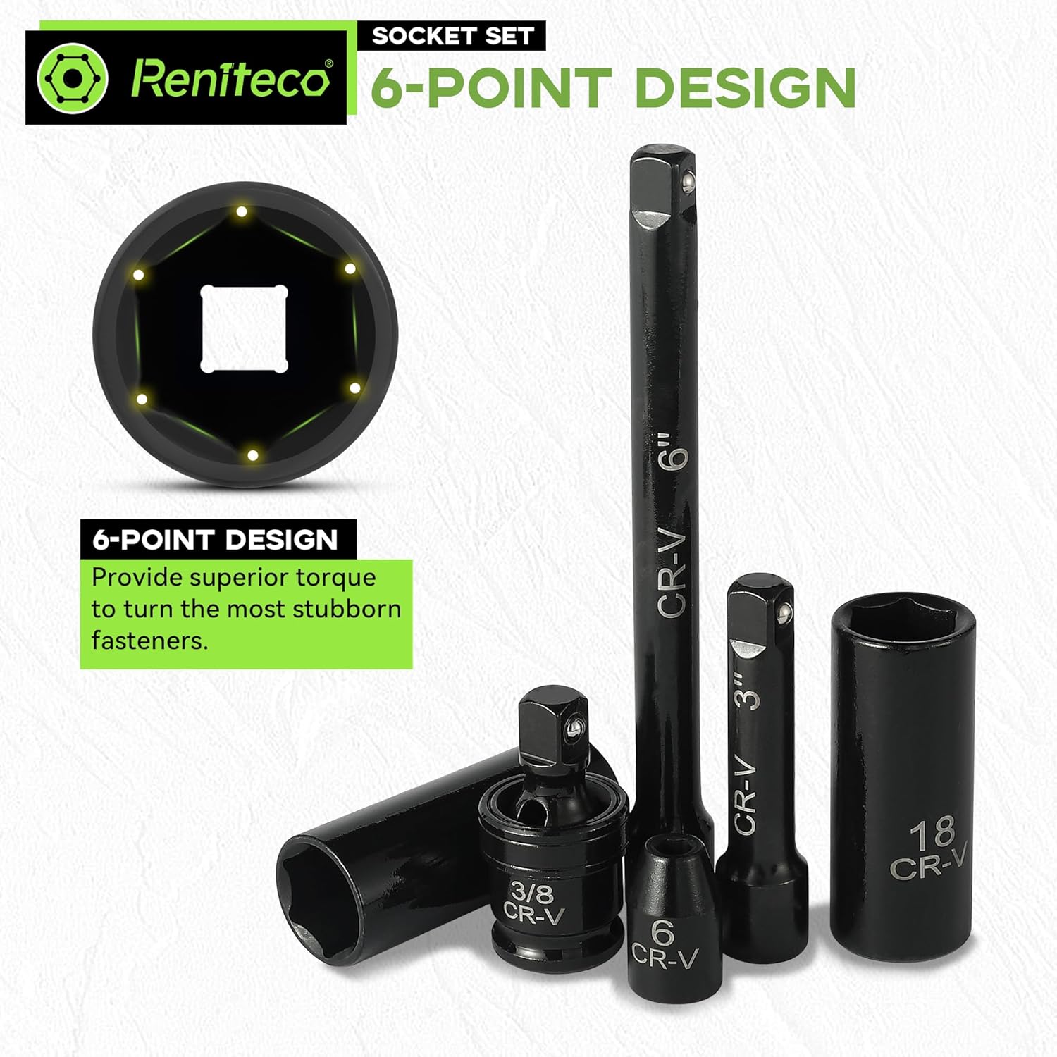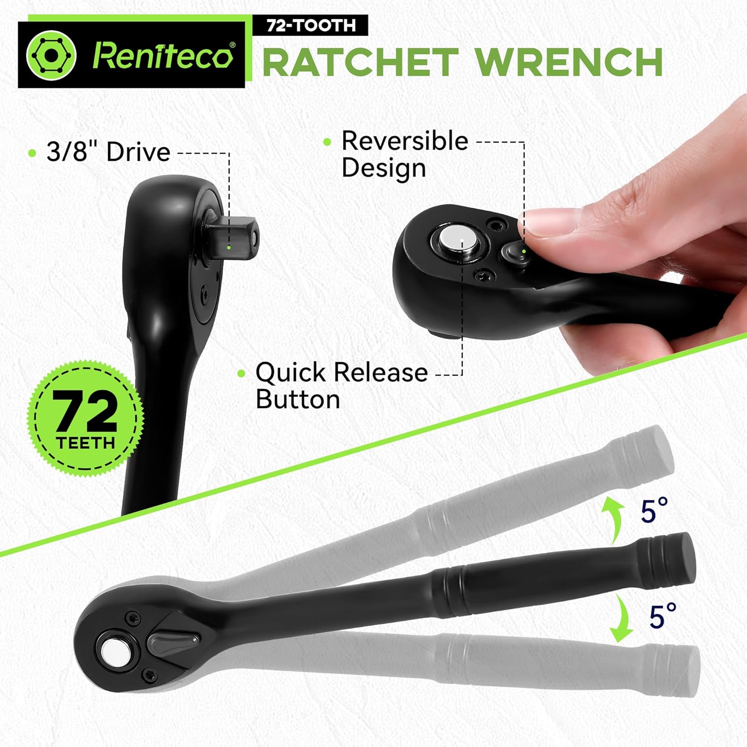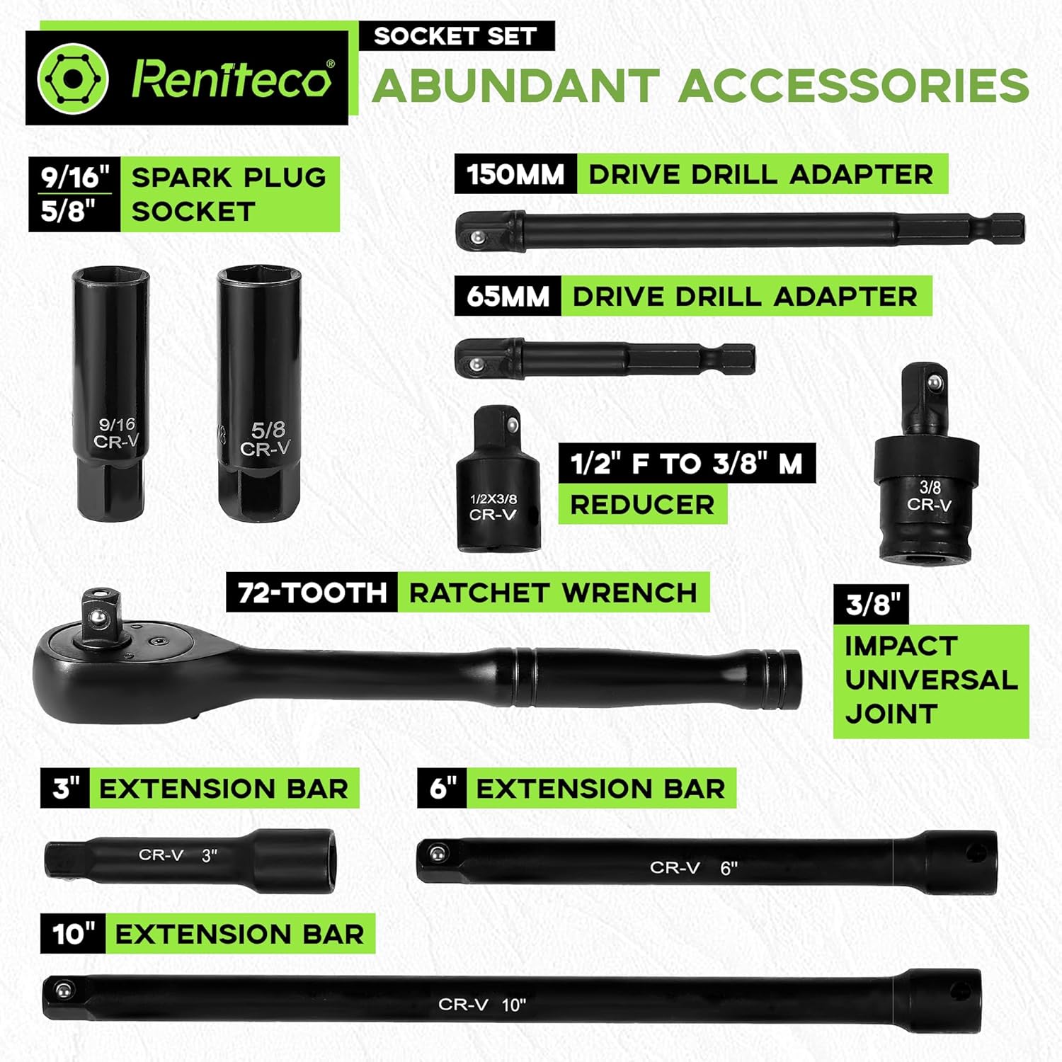 56-Piece 3/8" Drive Socket Set, SAE (5/16"-3/4") & Metric (8mm-22mm), Deep & Shallow, Ratchet Handle, Extension Bars, Adapter, Universal Joint, Power Drill Adapters, Spark Plug Sockets, CR-V