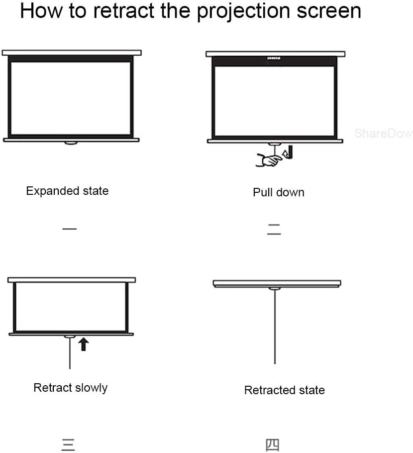 Features:MANUAL SCREEN CONTROL: This pull down movie screen ceiling/wall mount projector screen is fully retractable and has a self-locking mechanism so you can simply roll down/pull down the screen and then release softly & it will lock itself into position.MATTE WHITE SURFACE: The matte white fabric & black border frame of the video screen pull down hanging projector screen creates impeccable color balance to project realistic picture & deliver -wide off-axis viewing making every seat the best one.EASY TO ASSEMBLE: This compact, portable and lightweight wall/ceiling projector screen pull down has a durable construction & comes w/ two top loops that hook onto screws, nails, or bolts so the screen can be easily mounted on the ceiling/wall.HEIGHT ADJUSTABLE: Adjust the height by simply pulling down the screen to your desired level & then release softly. The pull down projector screen 100 inch allows for clear/vivid image & video capture & great for home theater cinema/film showing.Name: Self Locking Projector ScreenMaterial: Matte White Fabric Fiber Glass Specifications: 60 72 84 inchThrow Ratio: 16:9Package List:1 * Projector ScreenNote: Please wipe the screen with wet cloth to clean it. Do not wash it by hand or machine.Only the above package content, other products are not included.Note: Light shooting and different displays may cause the color of the item in the picture a little different from the real thing. The measurement allowed error is +/- 1-3cm.Due to the difference between different monitors, the picture may not reflect the actual color of the item.