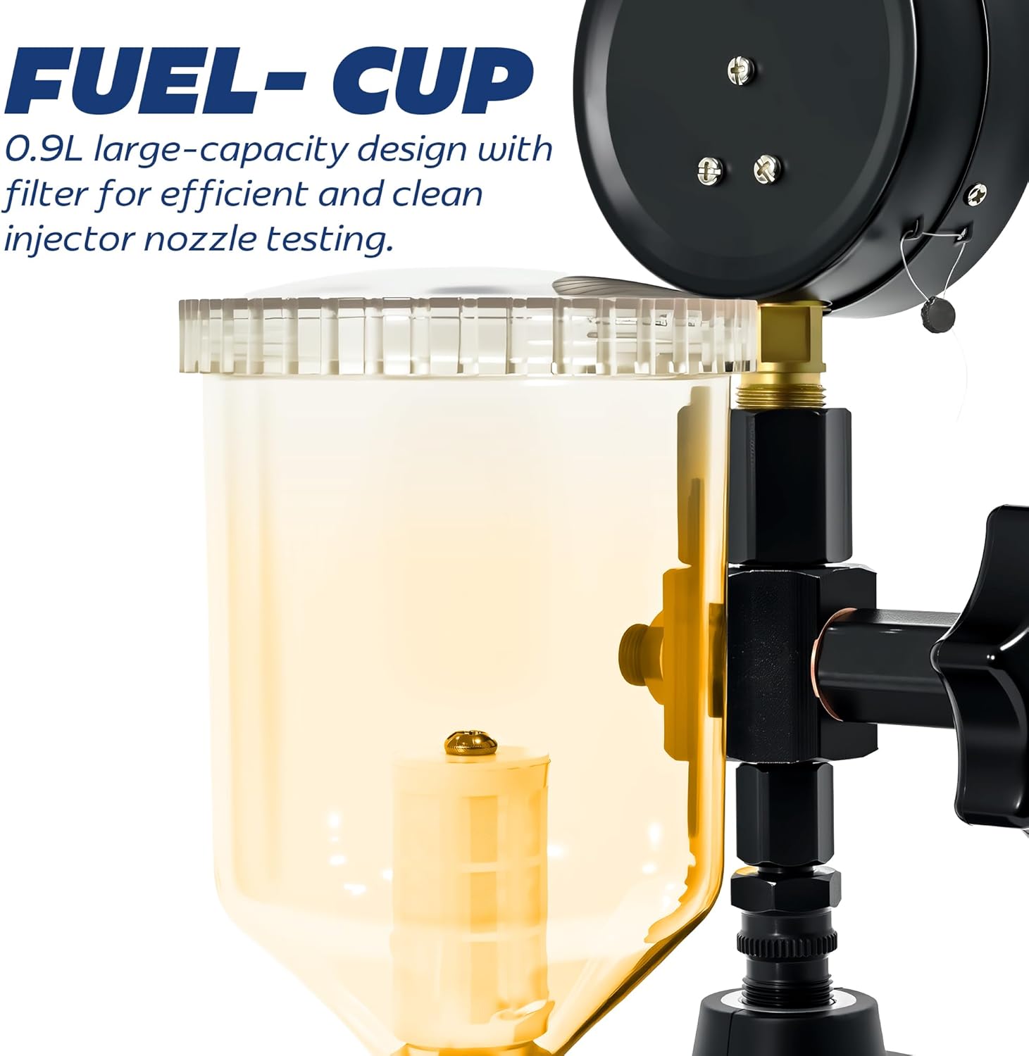 Diesel Fuel Injector Tester Kit features a 900ml fuel cup, a sturdy cast-iron body, a solid mountable base, and a 15in anti-slip handle, making it stable and durable to use