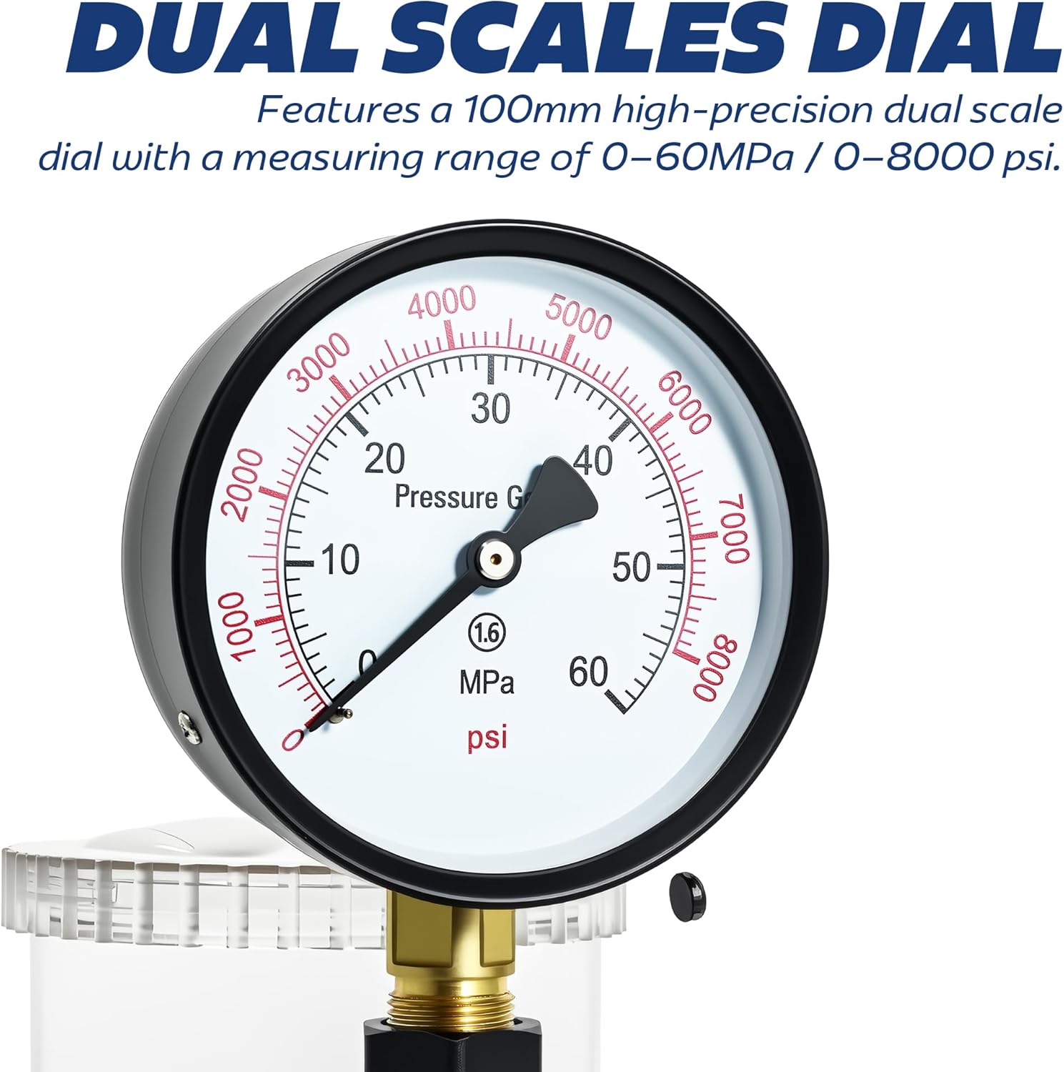Diesel Fuel Injector Tester Kit is equipped with a dual-scale gauge, with a large measurement range of 0-600 bar/ 0-8000 psi and a maximum test pressure of up to 60Mpa