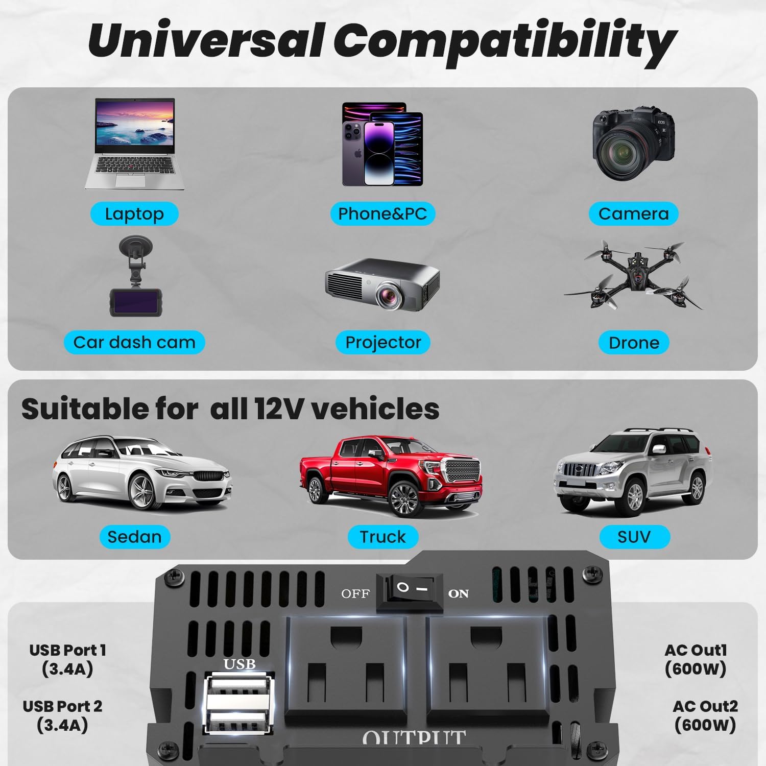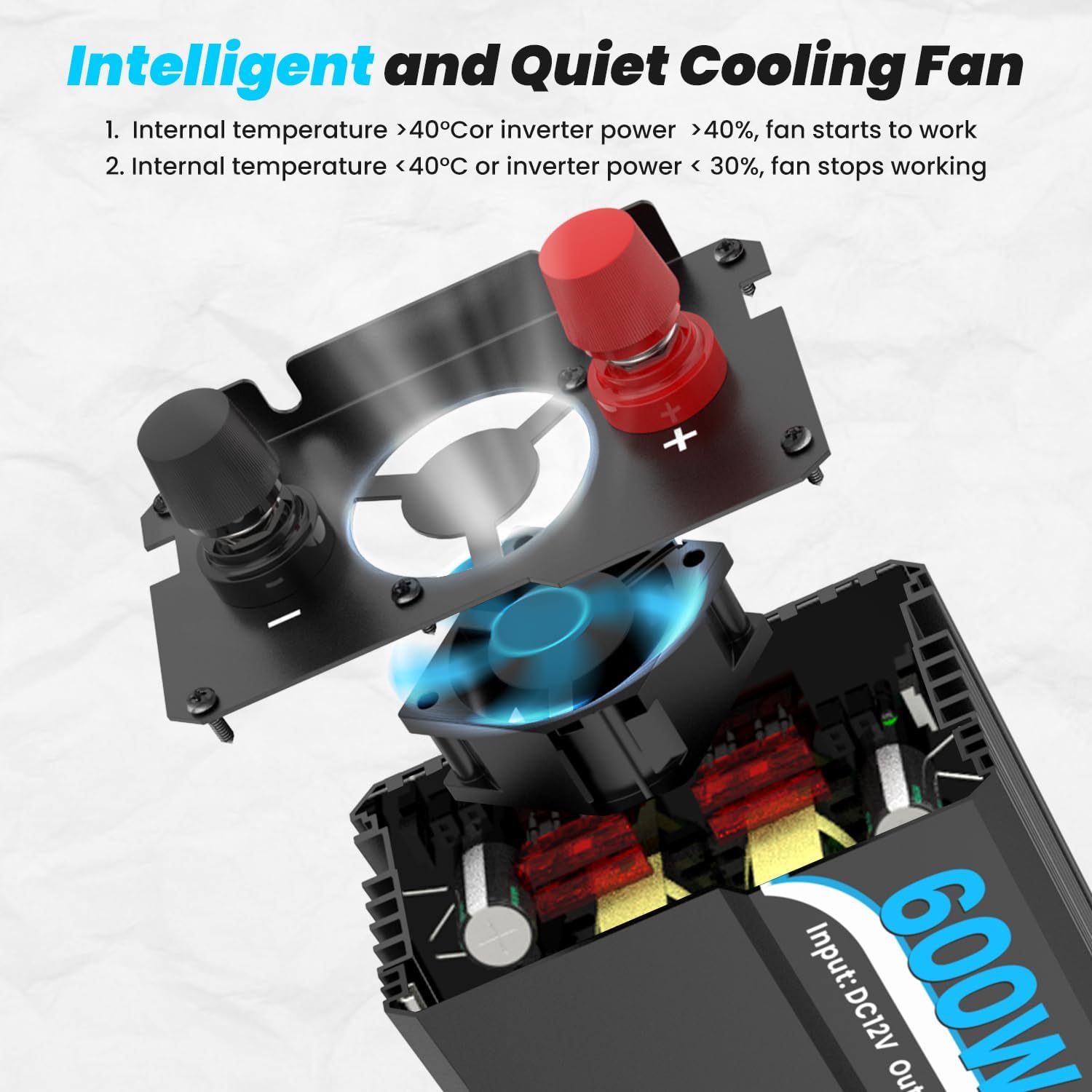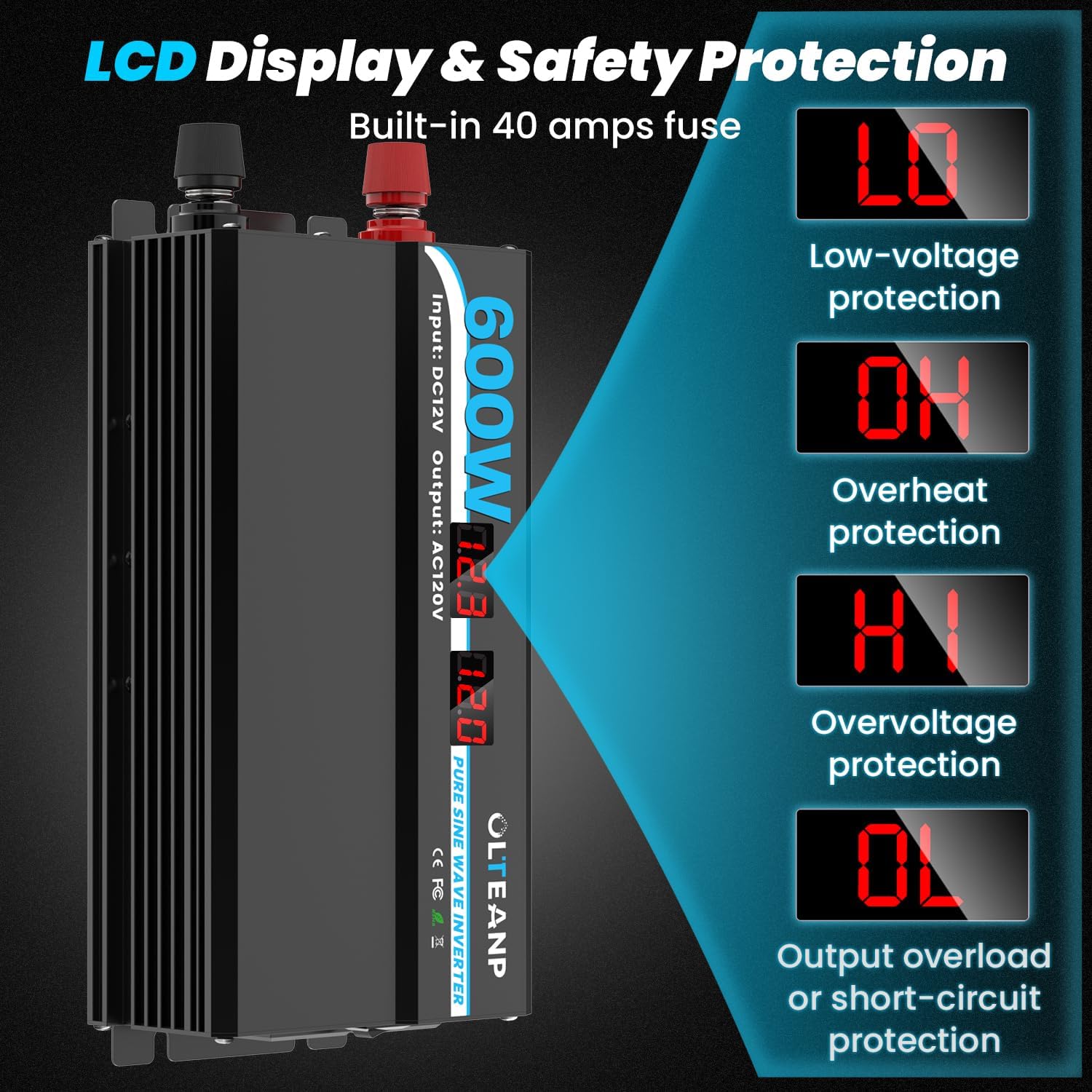 600W Power Inverter Pure Sine Wave Inverter 12V DC to 120V AC Converter for Car, Truck, Home, Vehicles, Laptop, Car Inverter 12V to 110V with 2 AC Outlets, 2 USB Ports, LCD Display