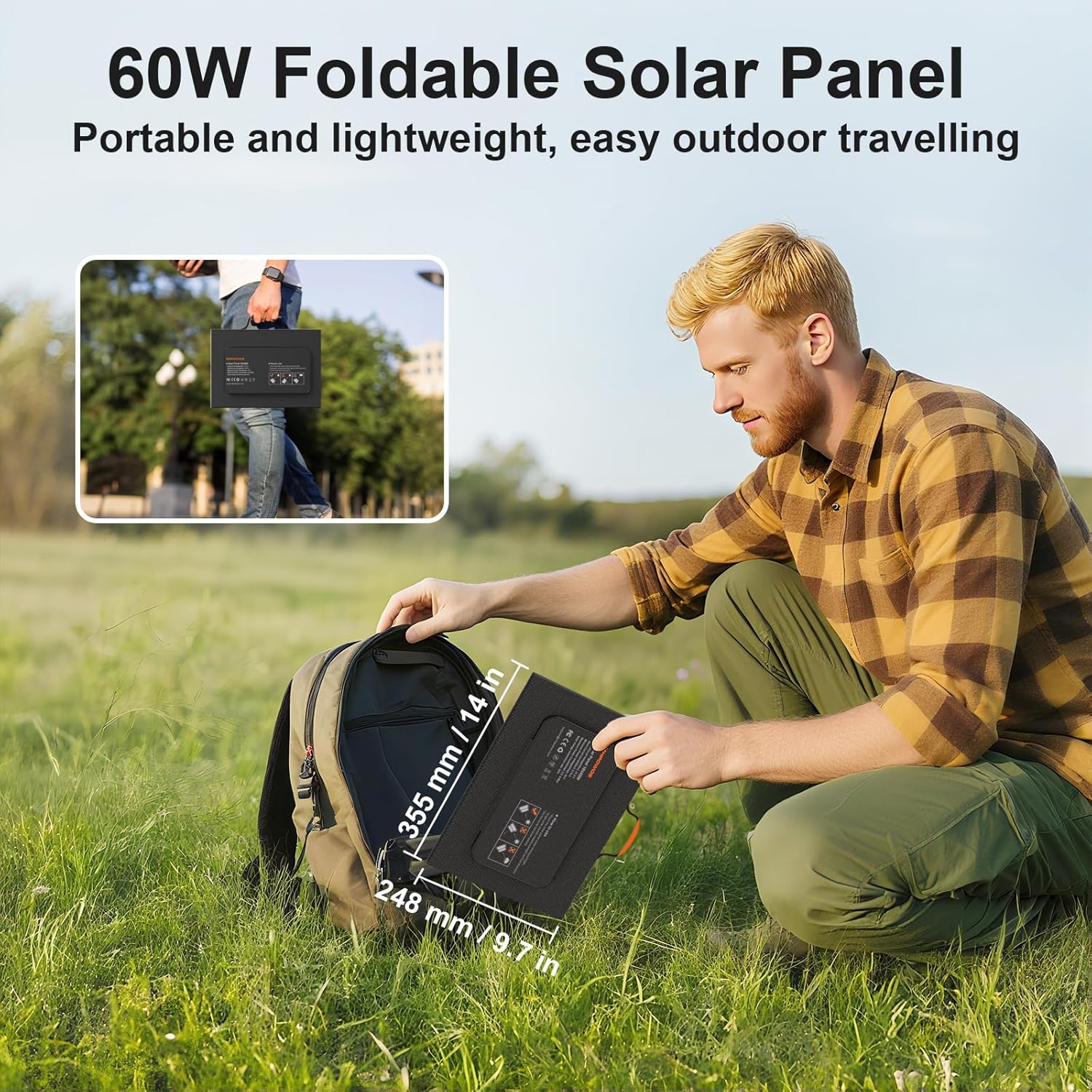 60W Portable Solar Panels Charger with USB-C, USB-A and DC Outputs Foldable IP67 Waterproof Solar Panel for Camping Hiking, Power Emergency for Small Power Station Generator, Phones, Power Bank