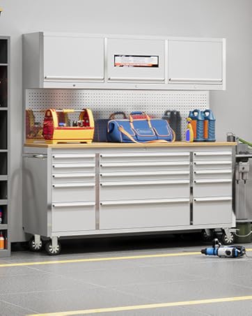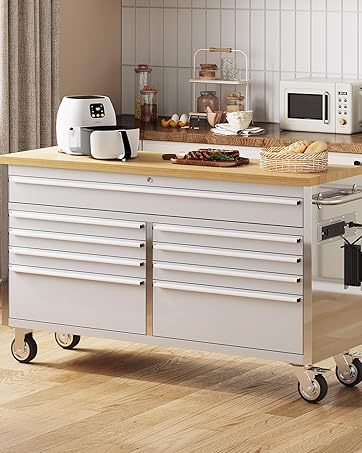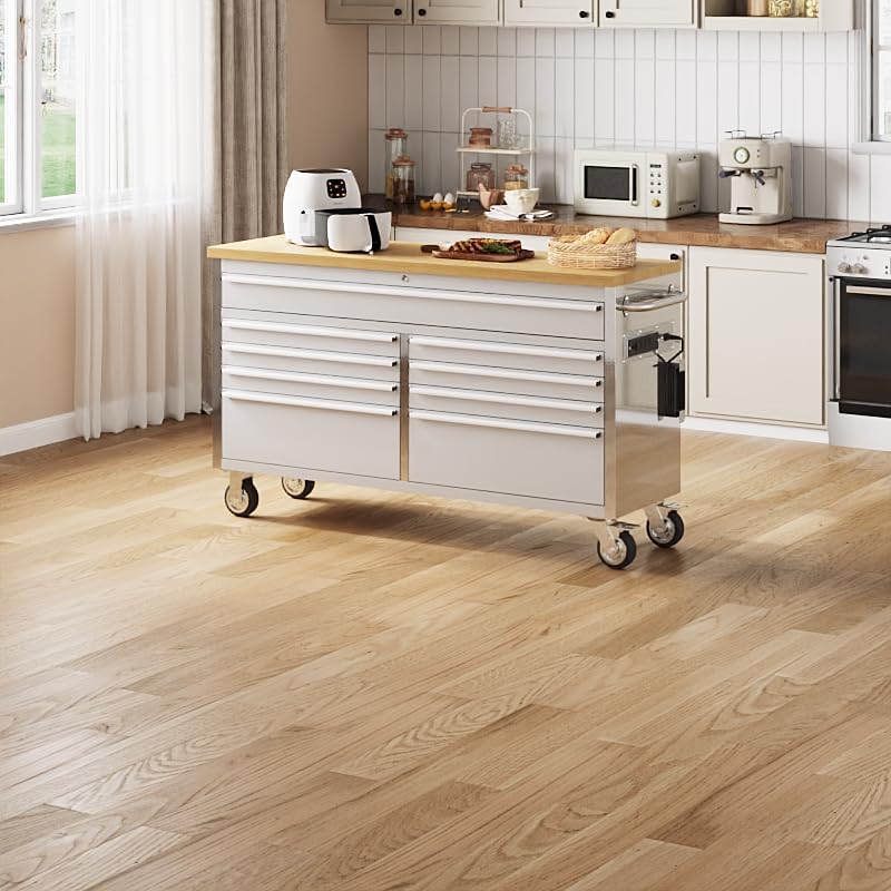 61 inch Rolling Tool Chest, Garage Workbench with 15 Drawers, Solid Rubber Wood Top & with Wheels Lock Key Locking, Mobile Workstation Tool Cabinet for Workshop Storage