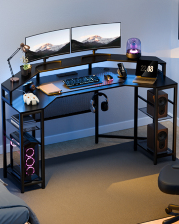 63" Computer Desk with Power Outlet & LED Light, Wing-Shaped Gaming Desk with Shelves, Full Monitor Stand,Wireless Charging,RGB Mouse Pad,Headphone Hook, Home Office Desk (Black)