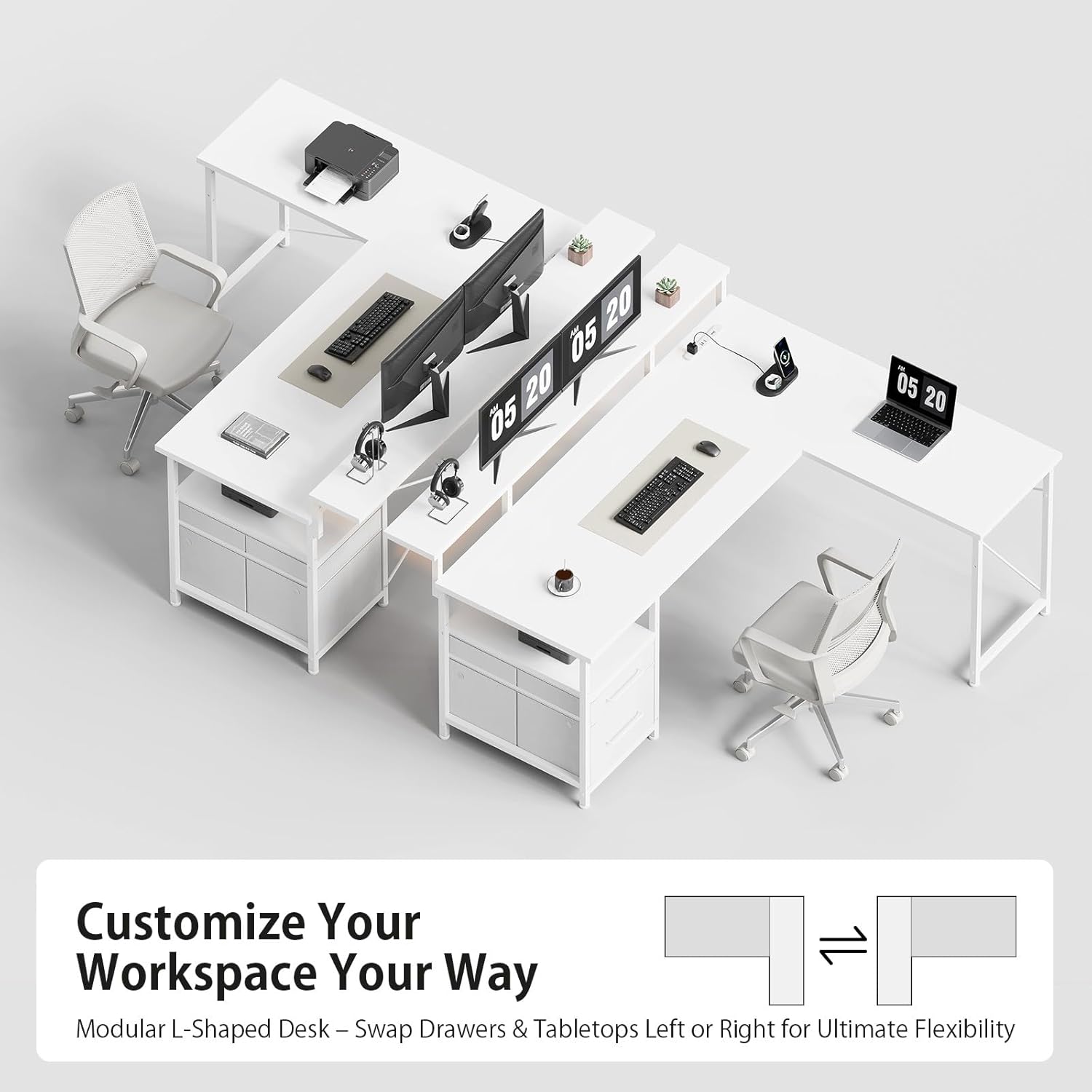 63" Gaming Desk with LED Lights, L Shaped Desk with Monitor Stand, Computer Desk with Drawers, PC Desk with Outlets, Office Desk with Monitor Stand, White