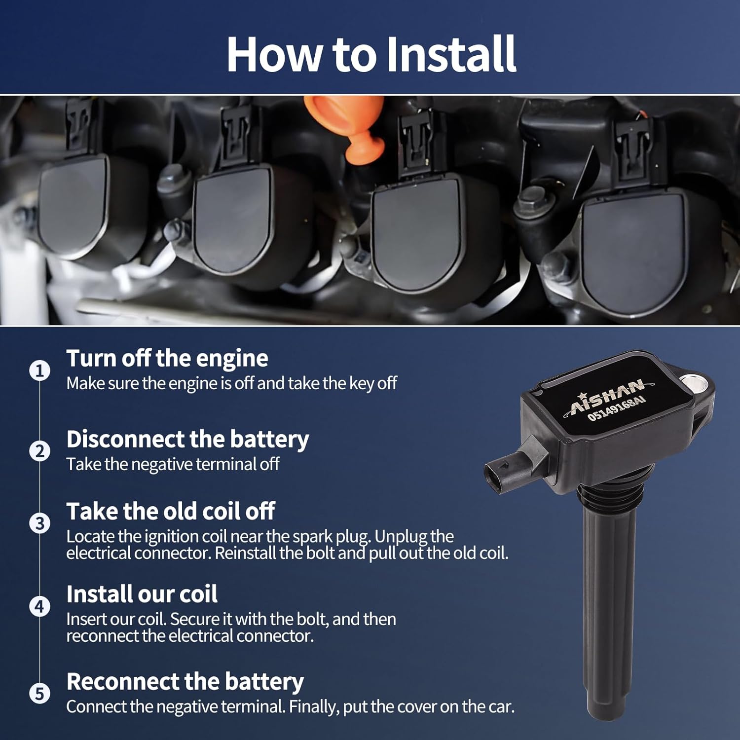 Please turn off the engine and ACC power supply before installation and wait for the engine to cool down. when replacing the ignition coil, please clean the carbon deposit on the spark plug or replace the spark plug with high-quality spark plug to ensure the smooth and powerful ignition system.